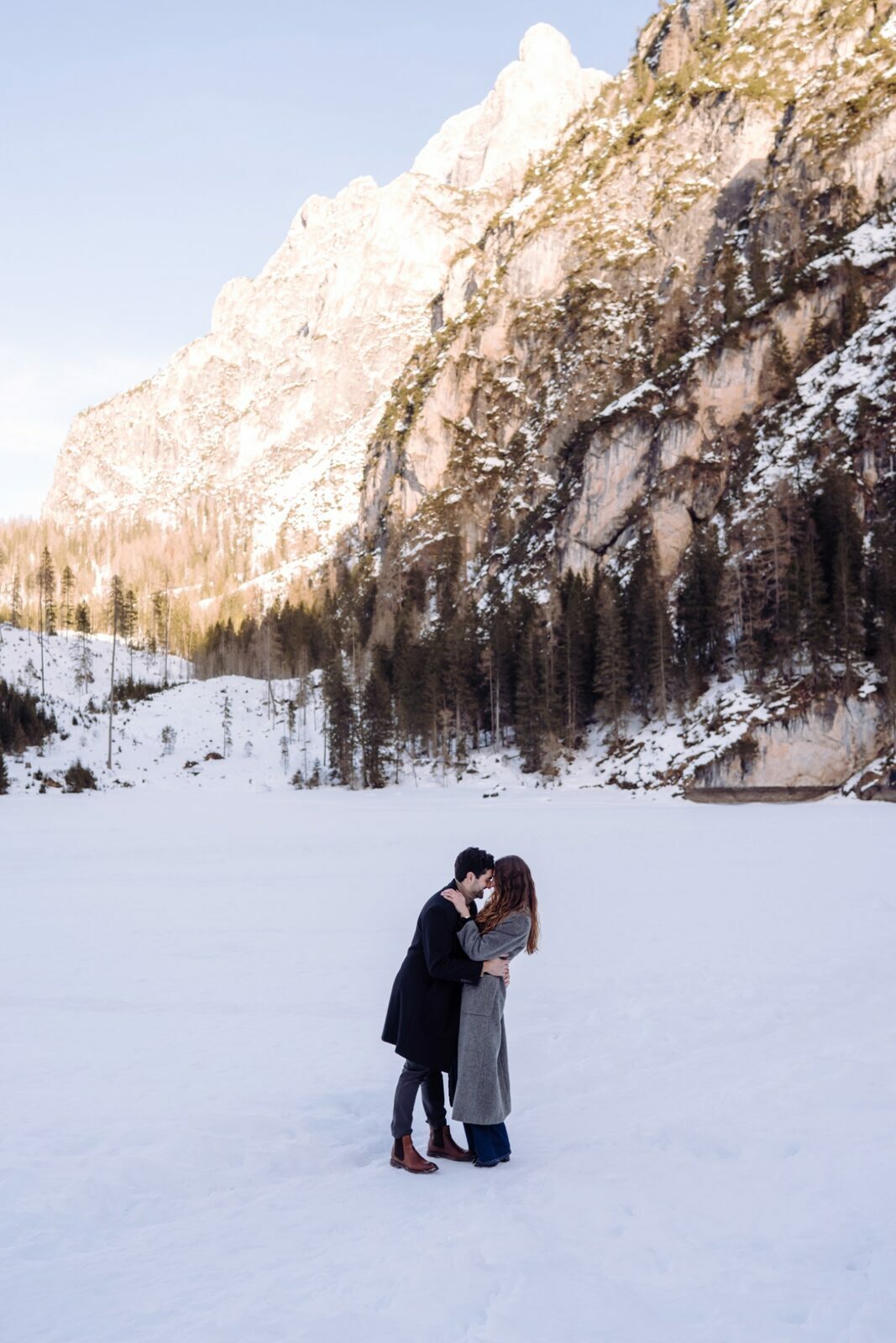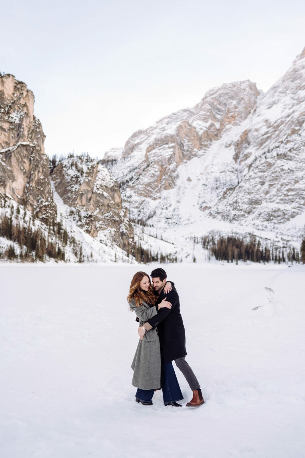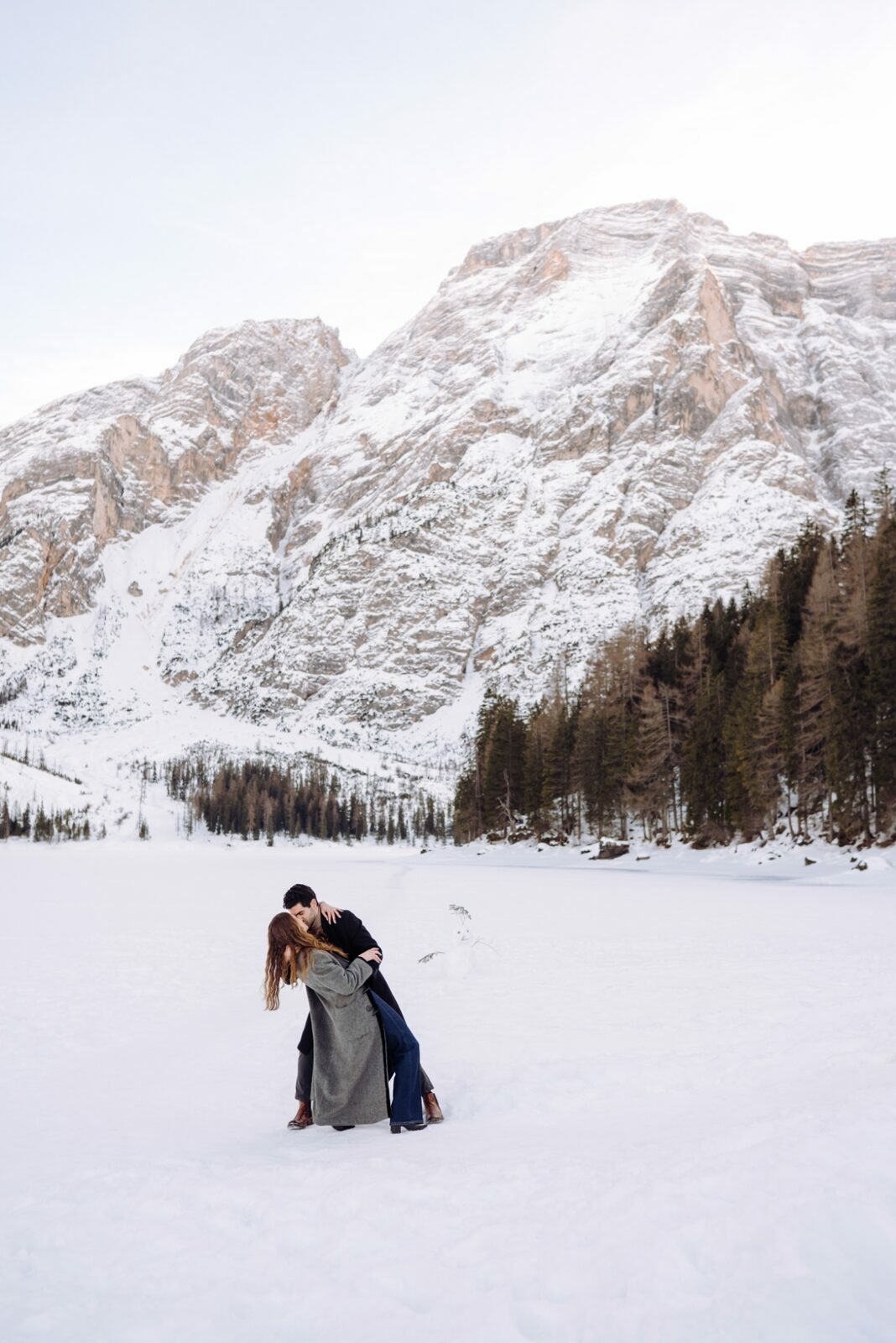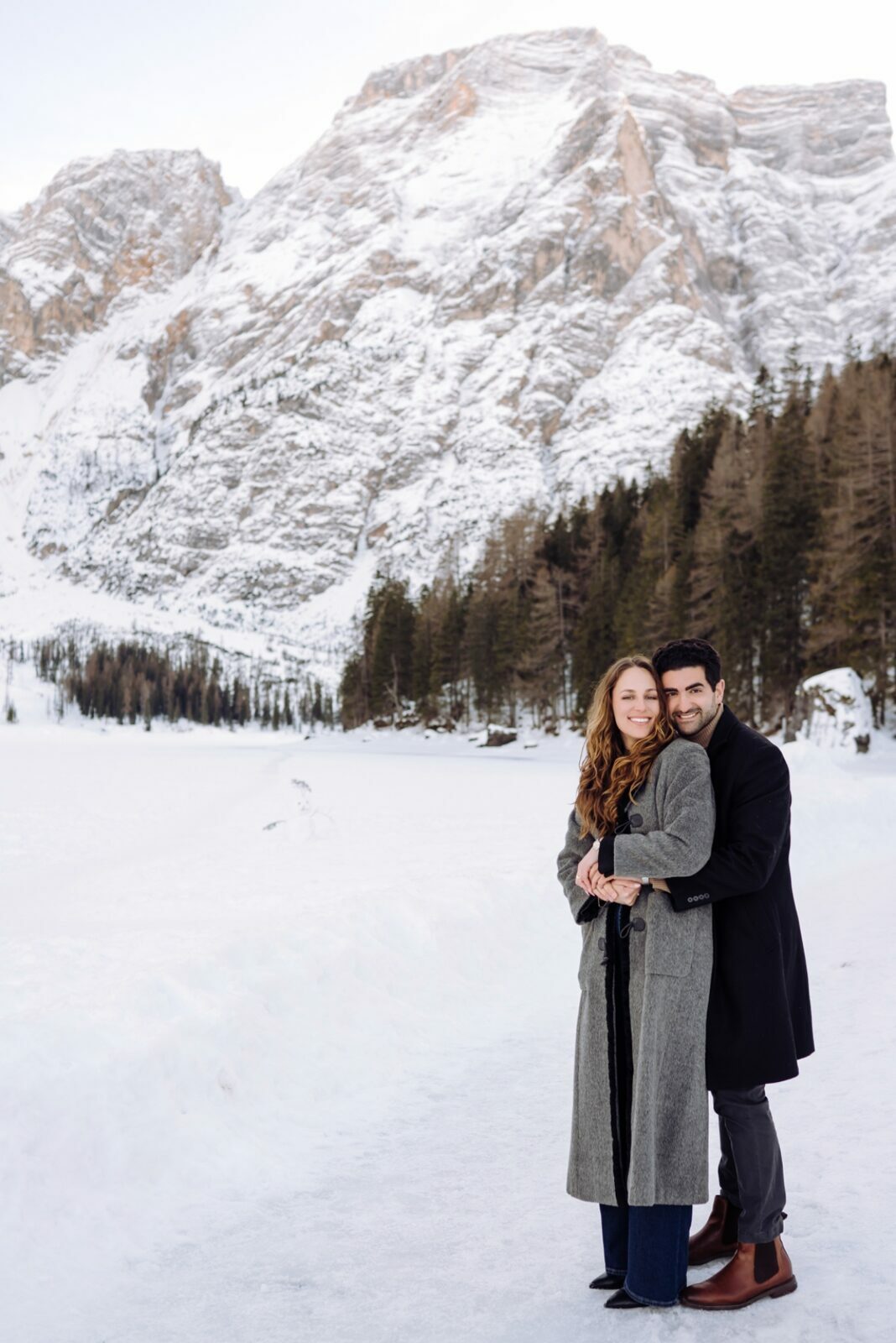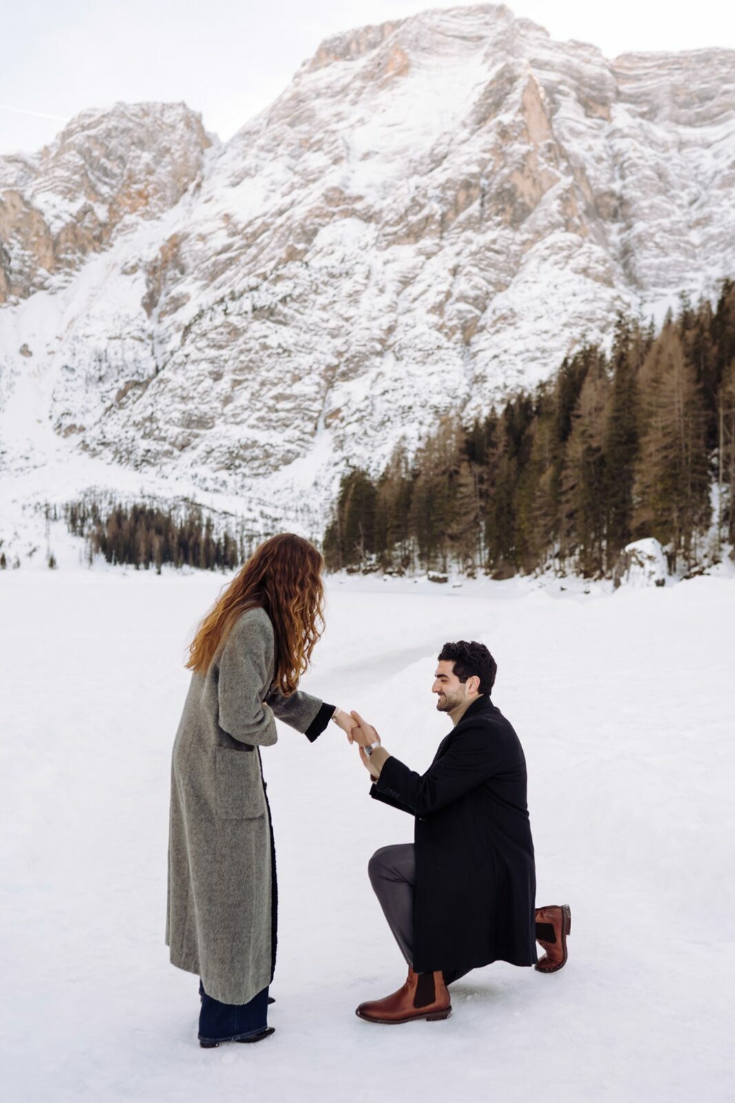 Pedido de casamento sobre o congelado Lago di Braies, nas Dolomitas
