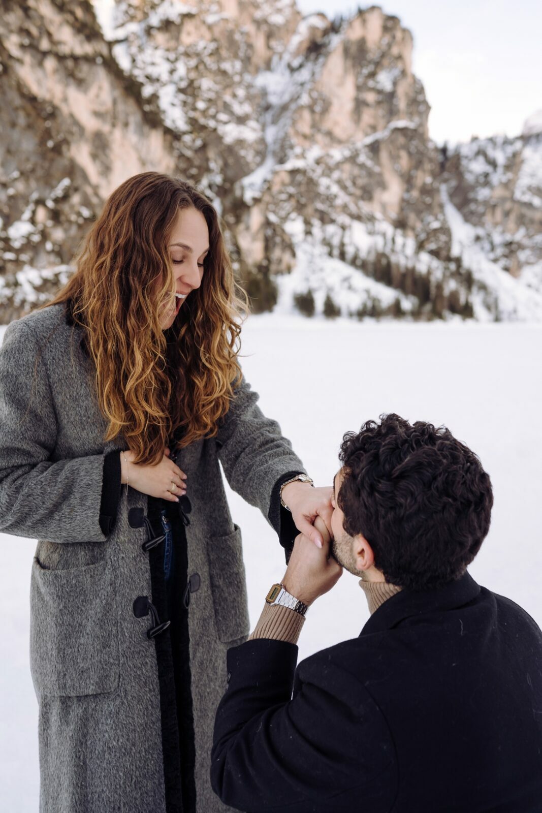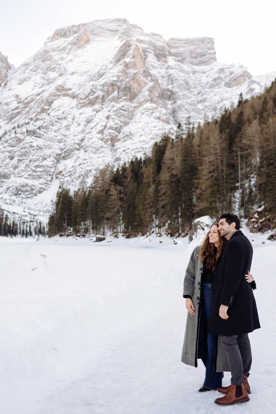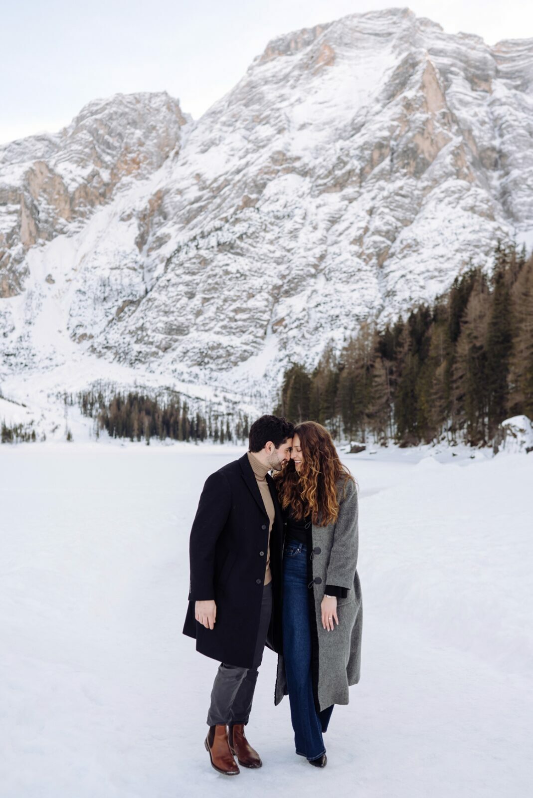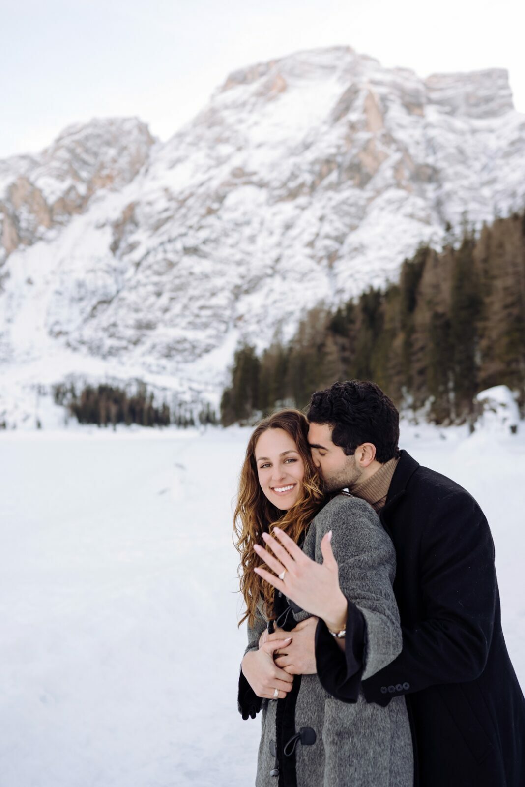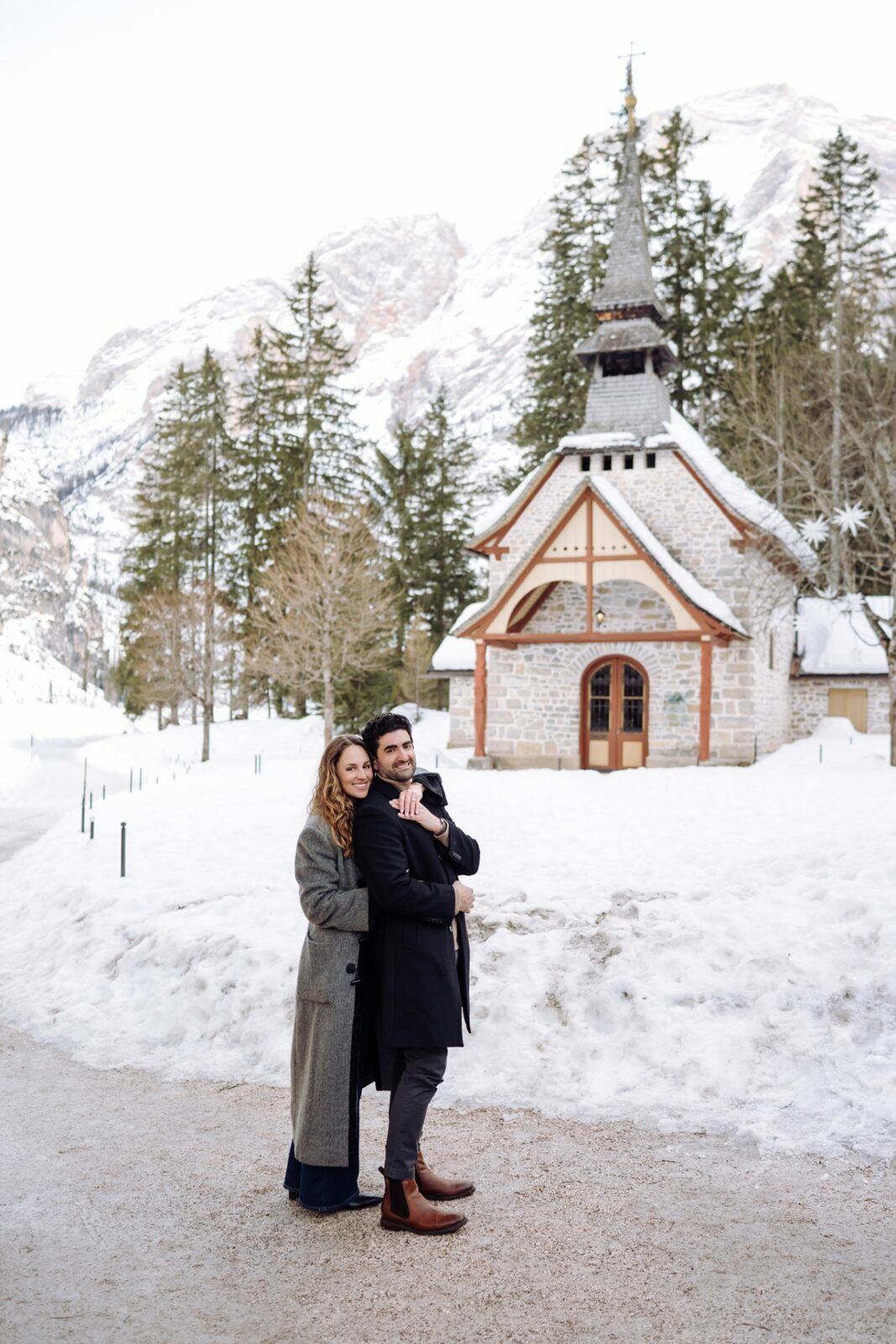 Pedido de casamento sobre o congelado Lago di Braies, nas Dolomitas