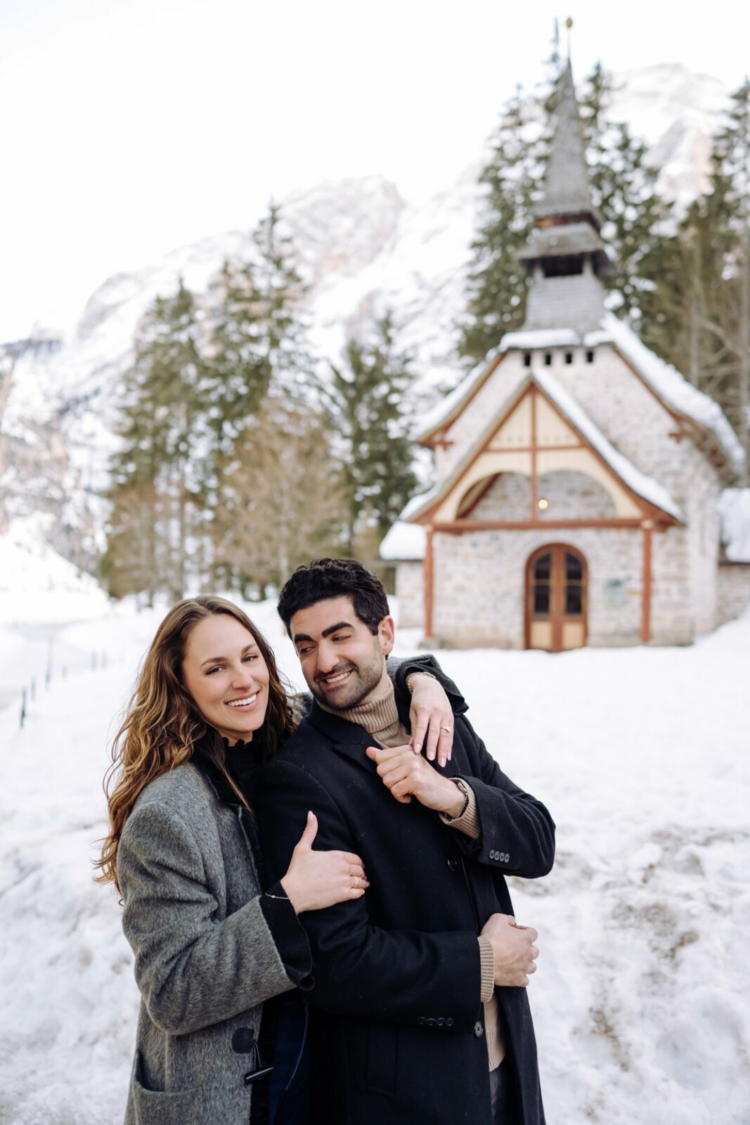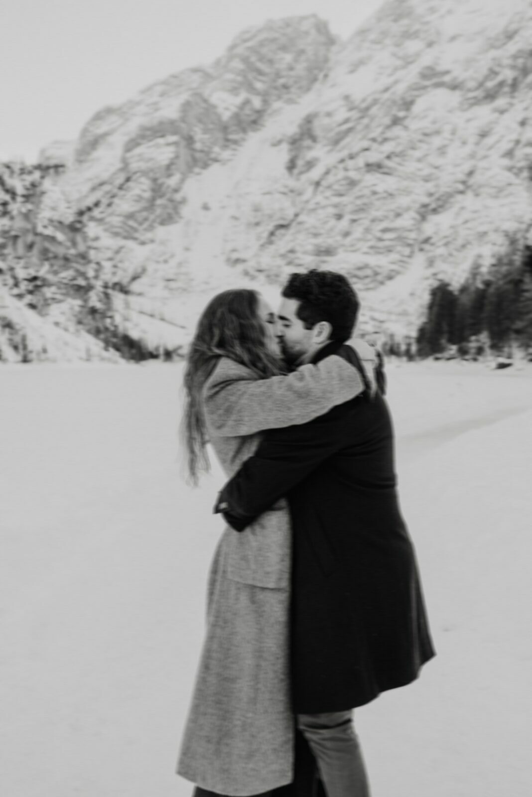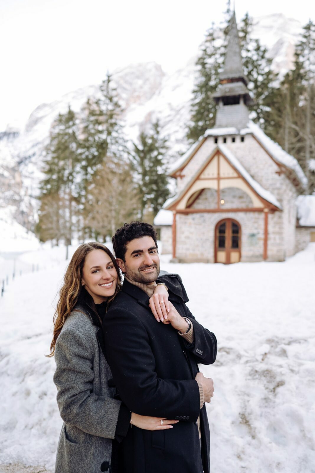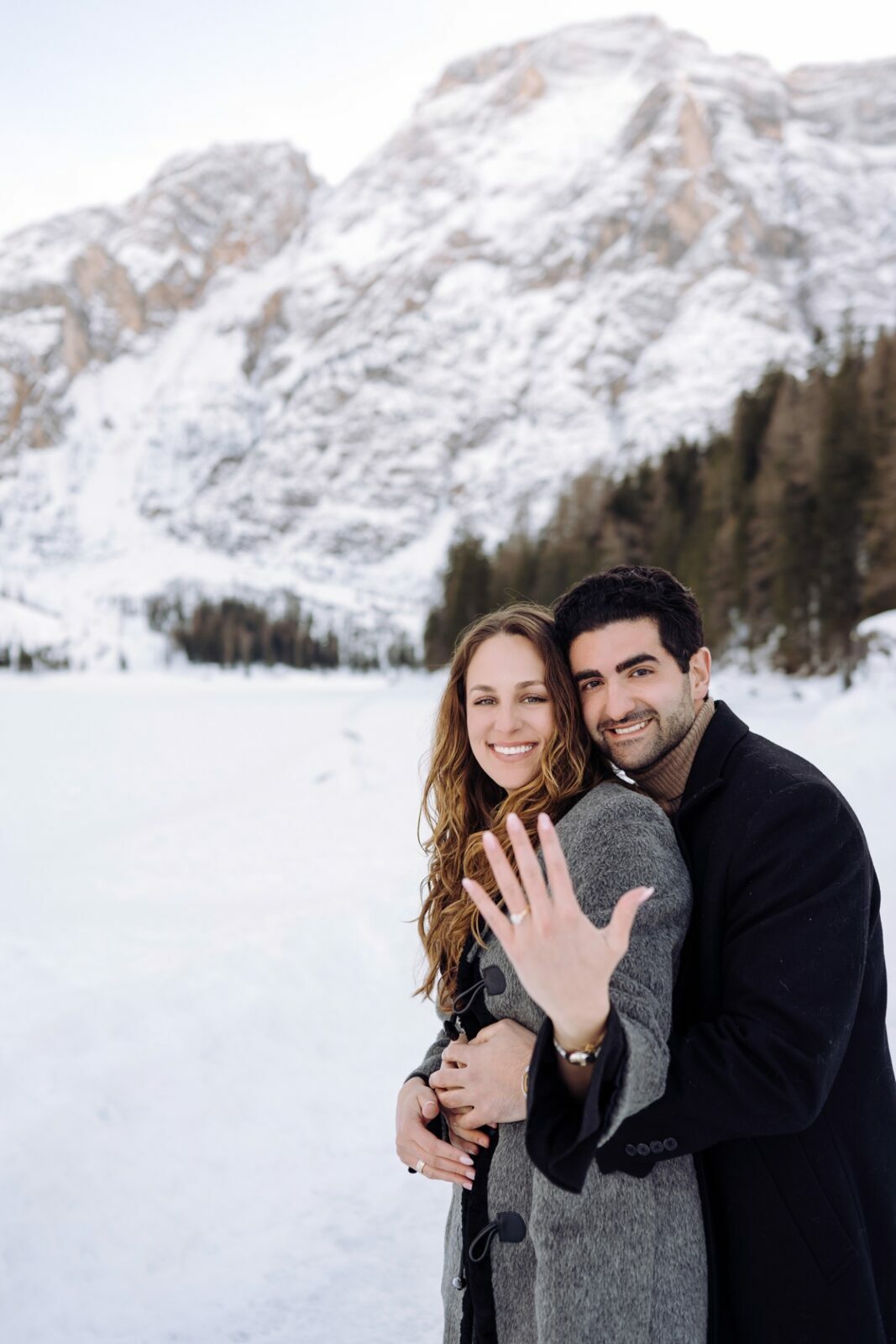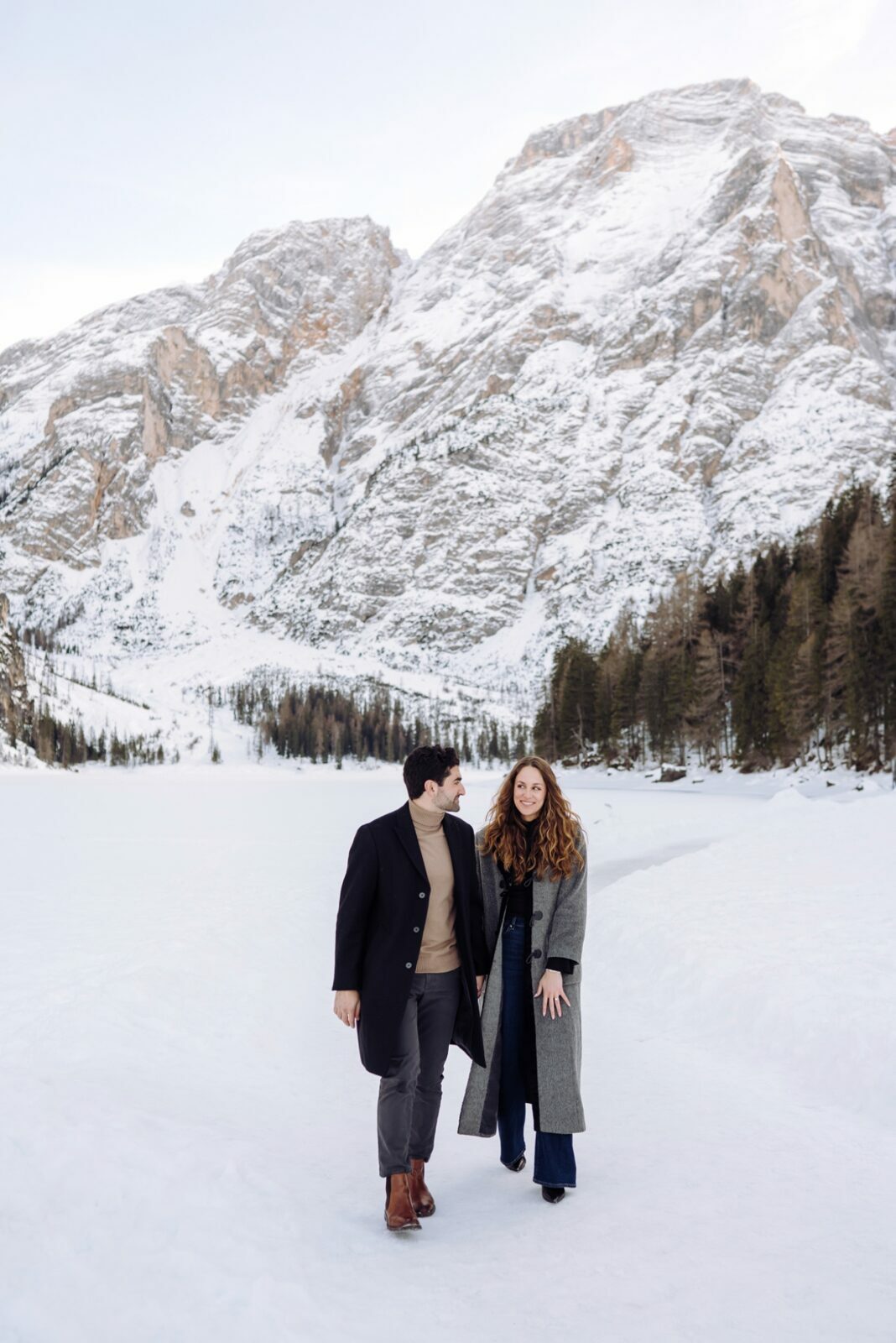 Pedido de casamento sobre o congelado Lago di Braies, nas Dolomitas