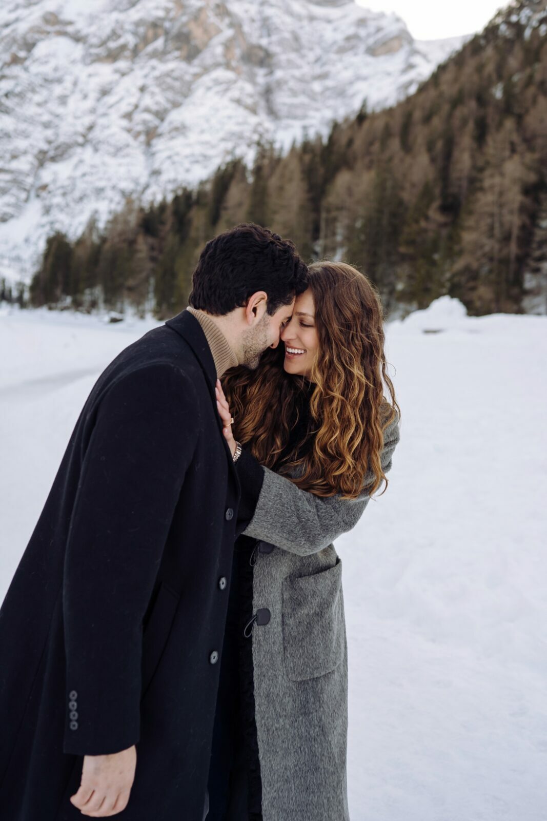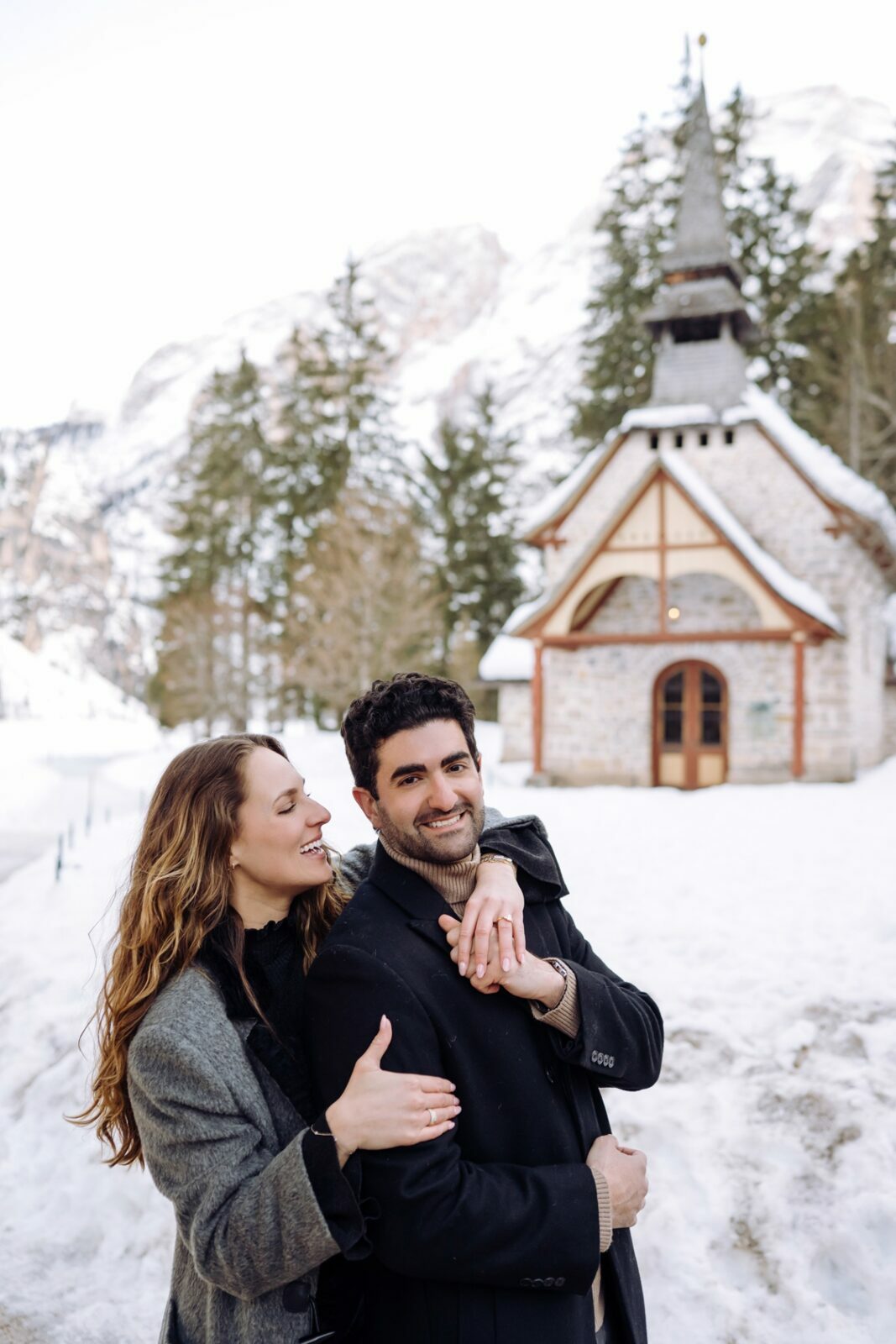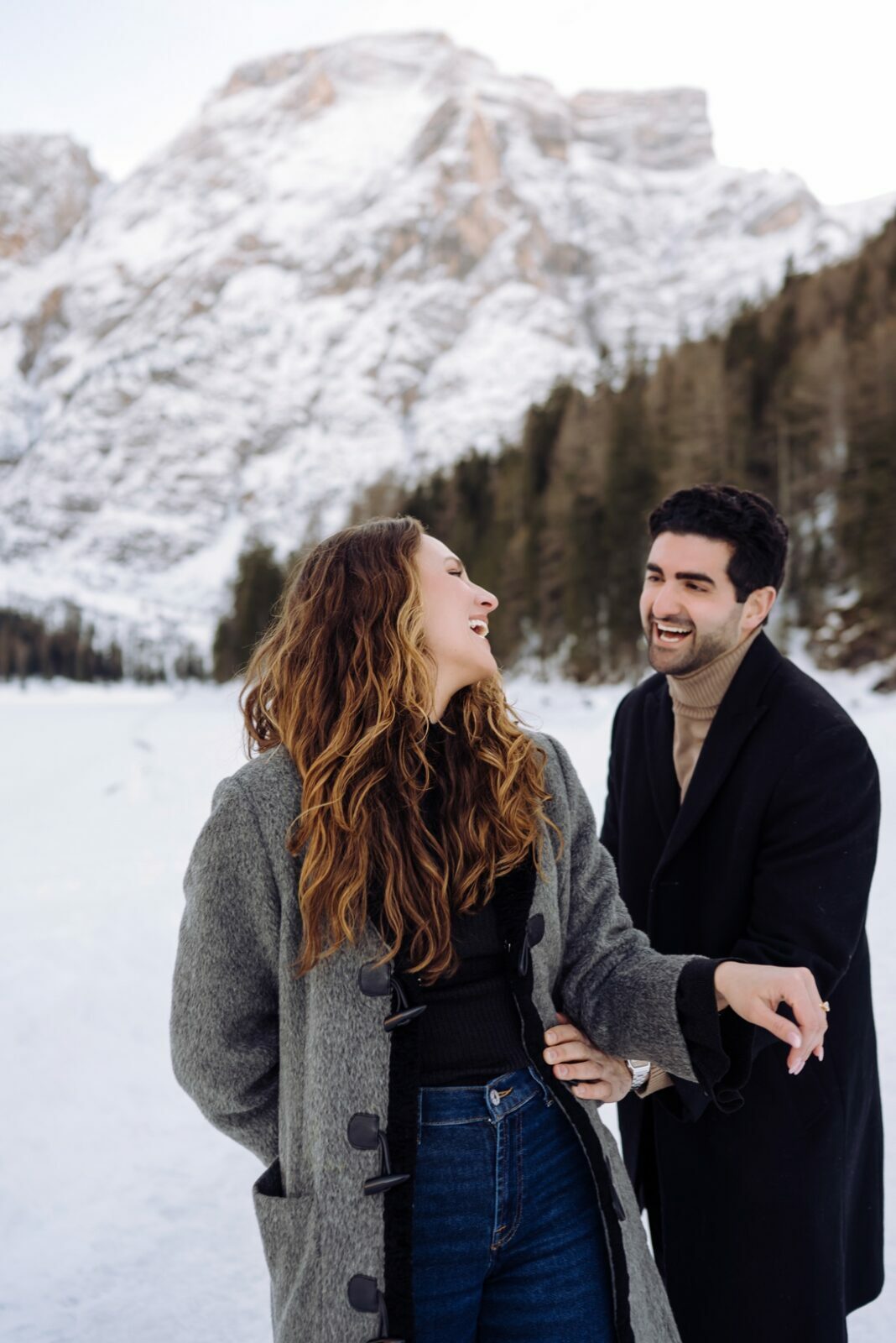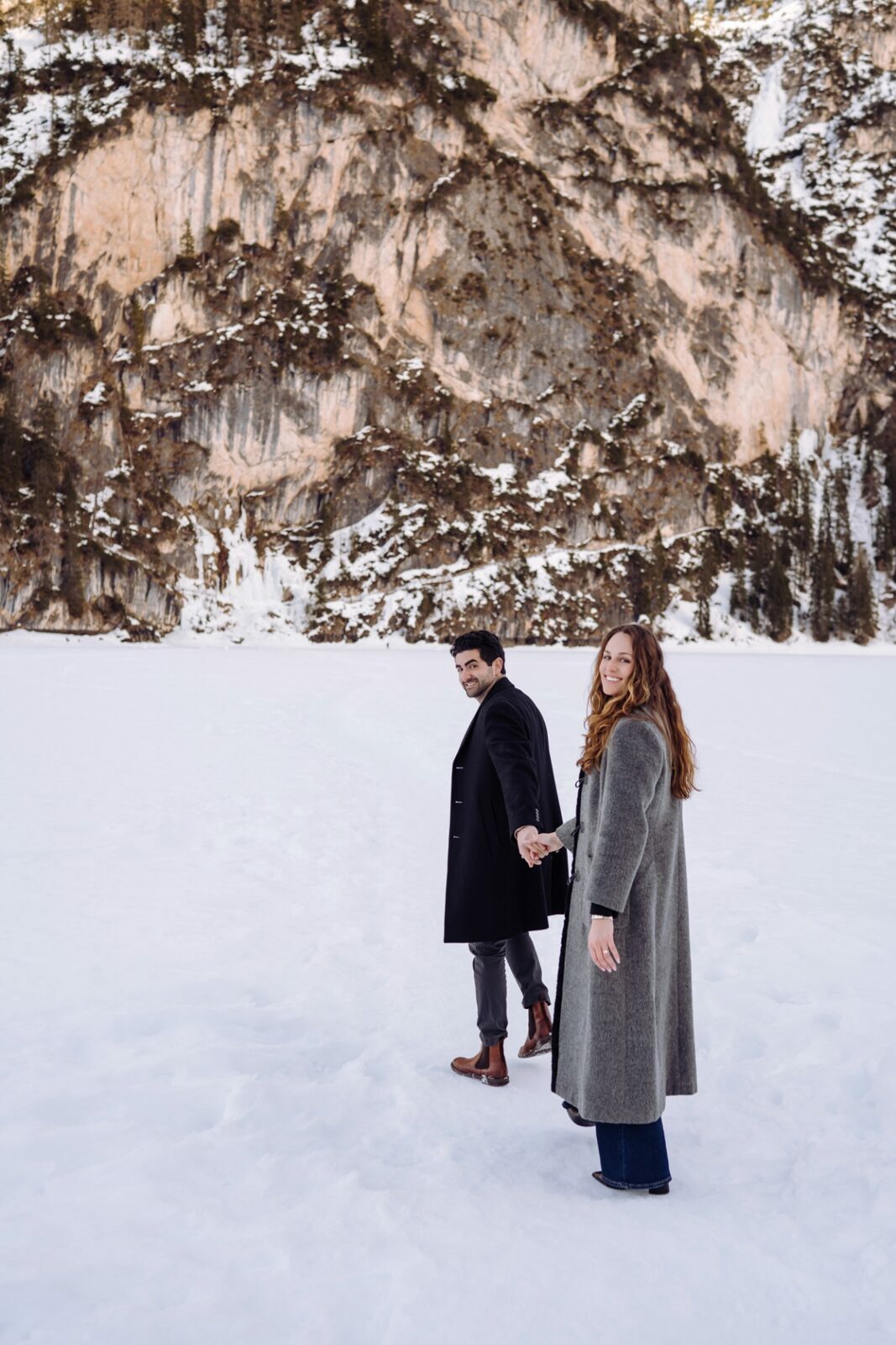 Pedido de casamento sobre o congelado Lago di Braies, nas Dolomitas