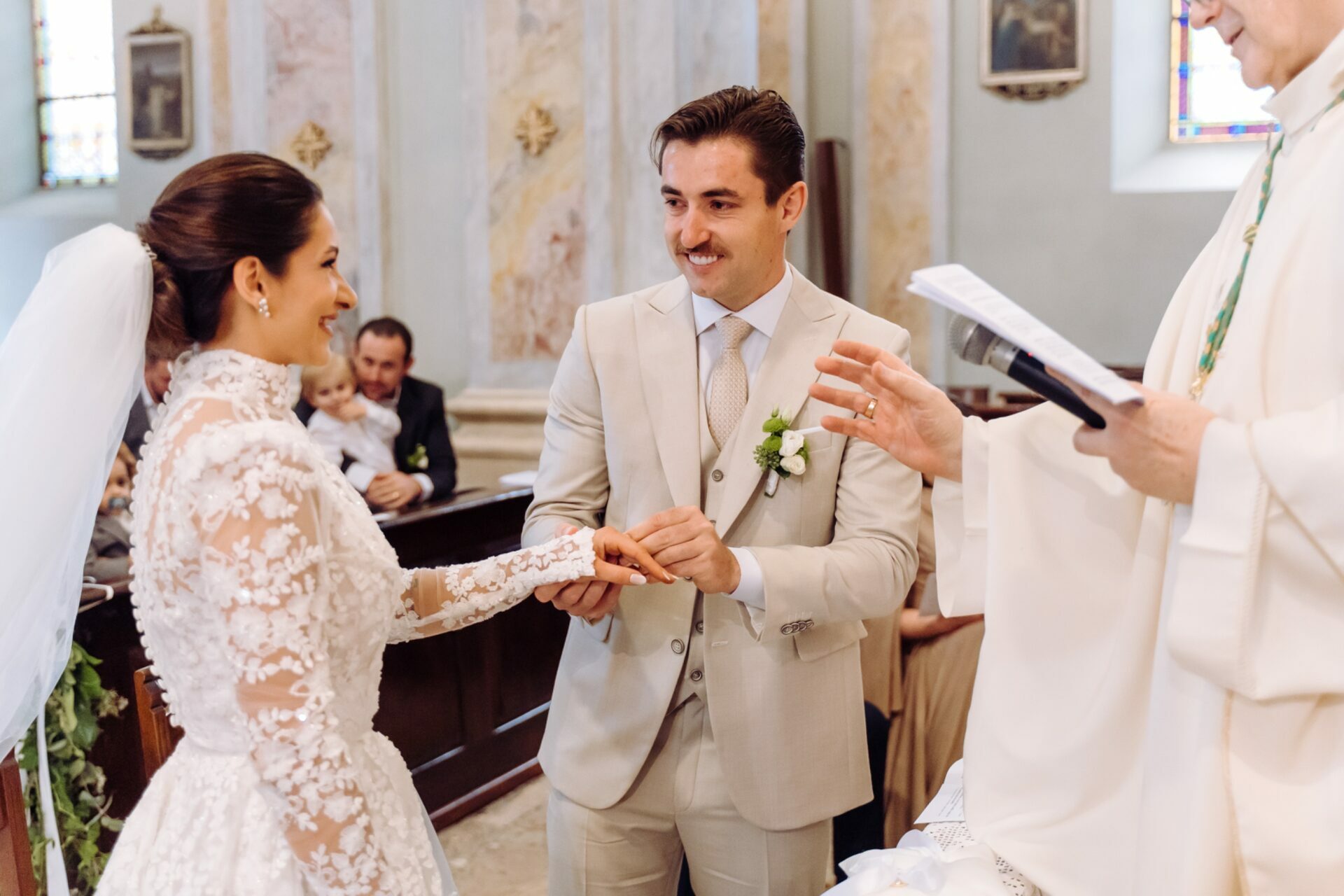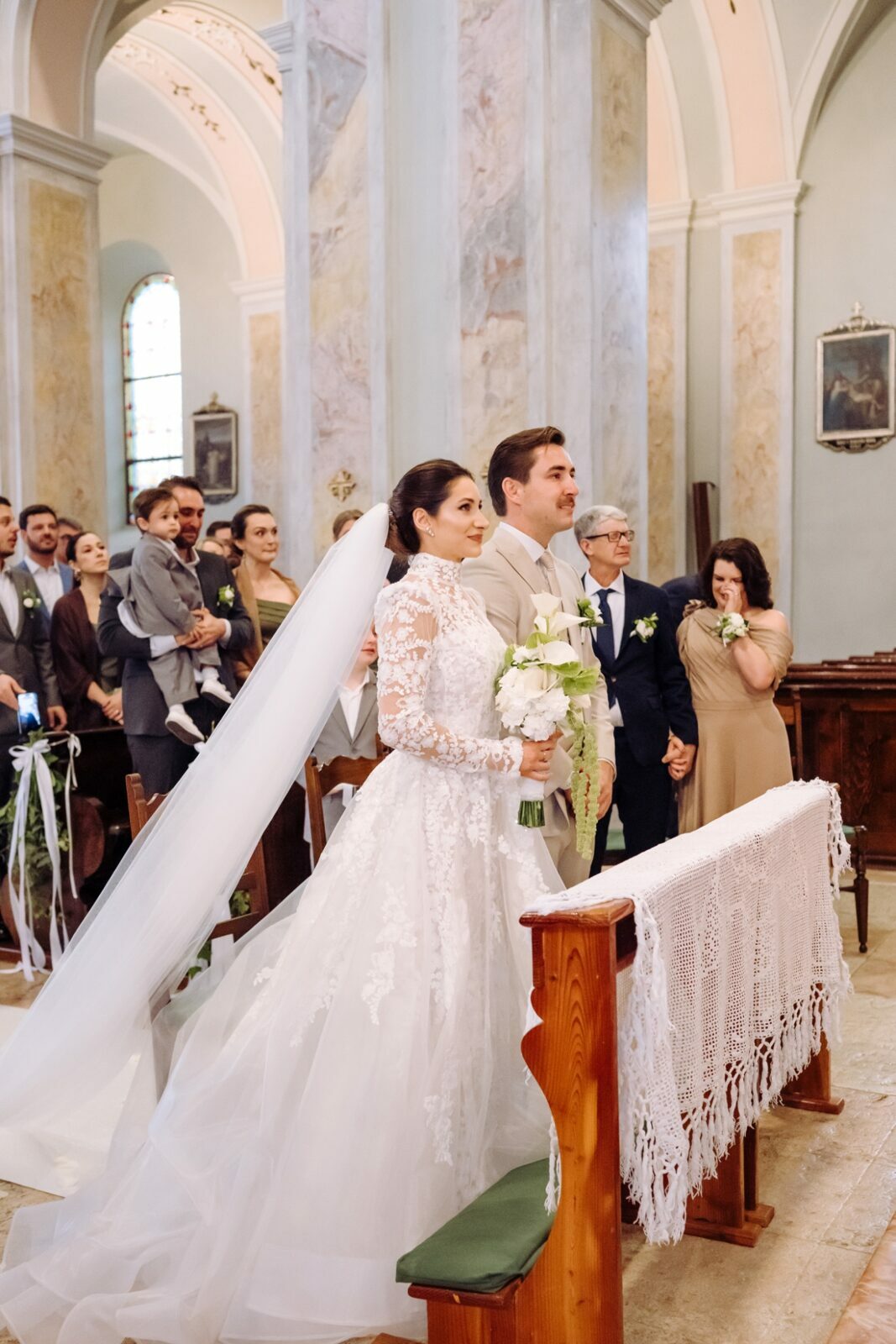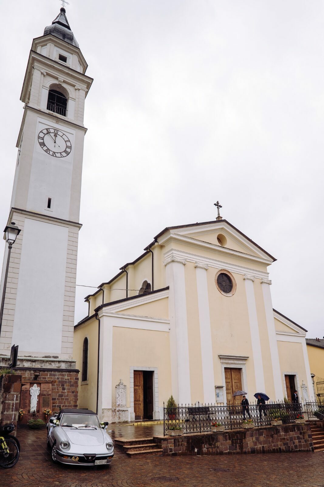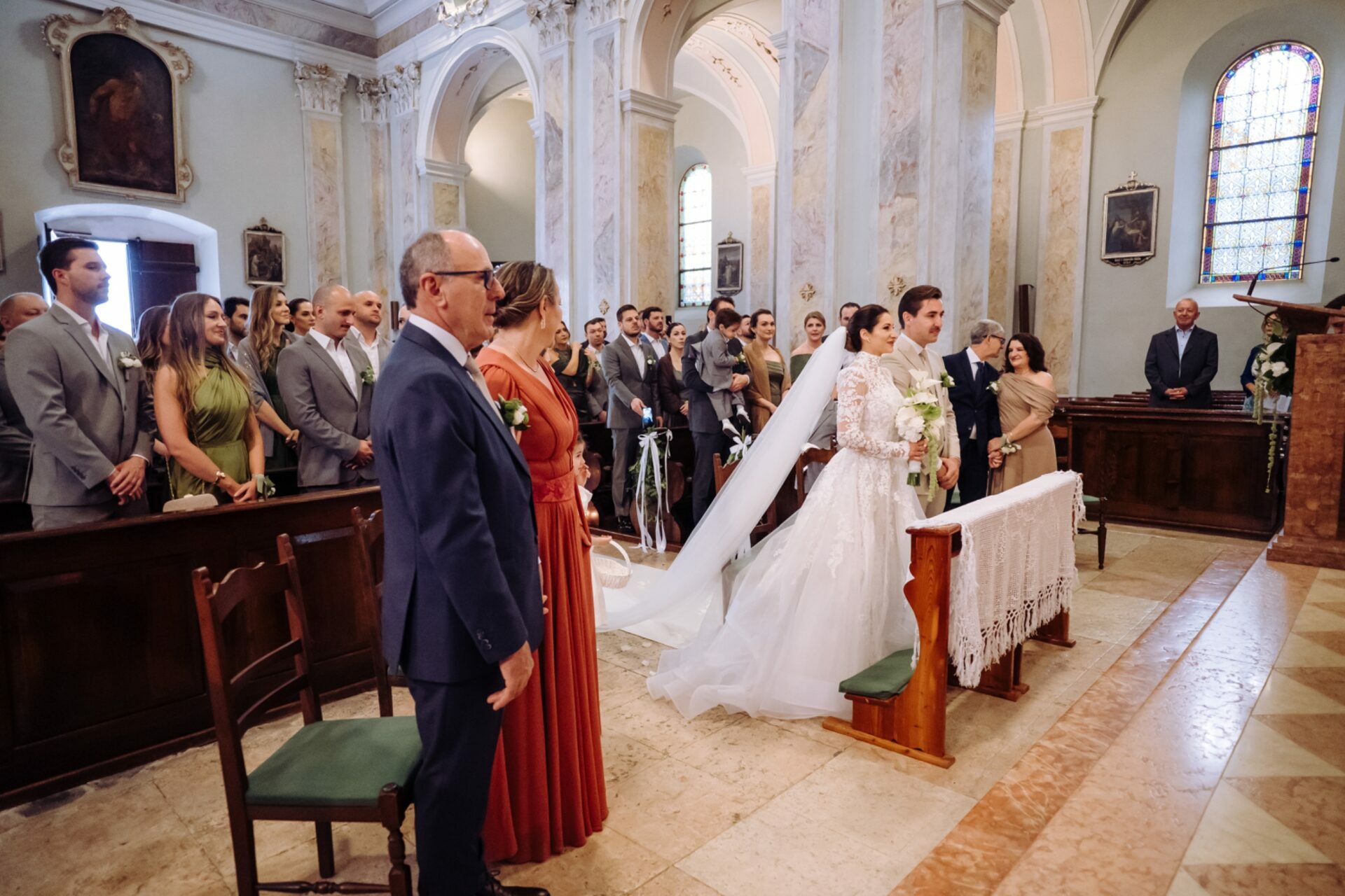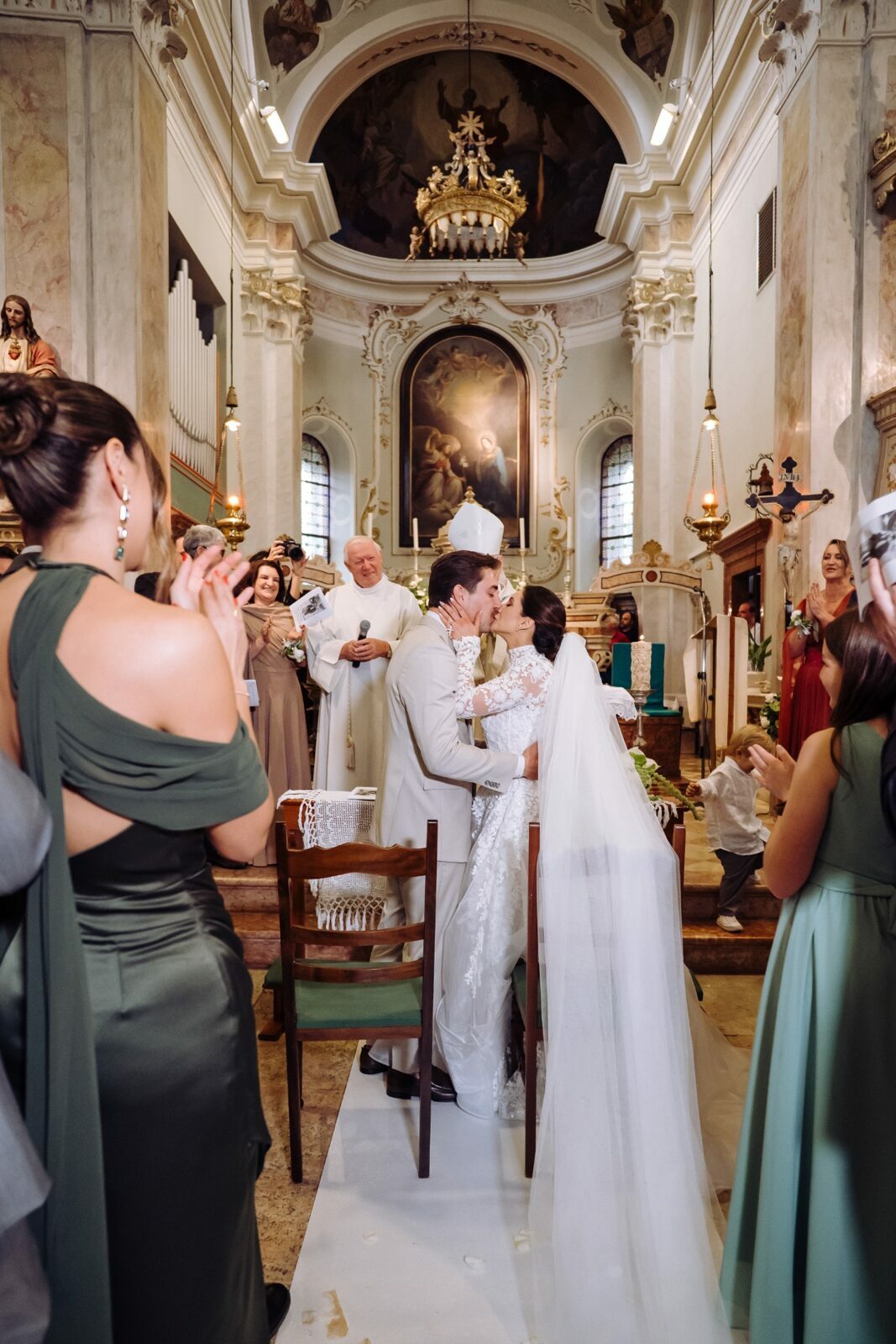 Casamento na terra dos antepassados do noivo, autêntico e emocionante. Cerimônia na igreja, na província de Trento, e recepção na Villa Bortolazzi, cercada por montanhas e parreirais. Destaque pro almoço em uma sala cheia de afrescos animado por um trio de músicas típicas italianas