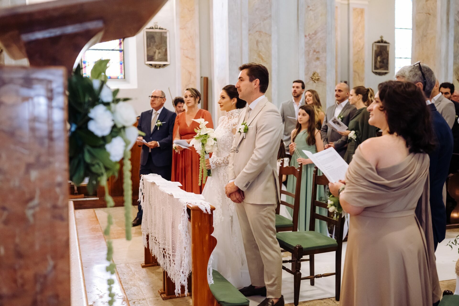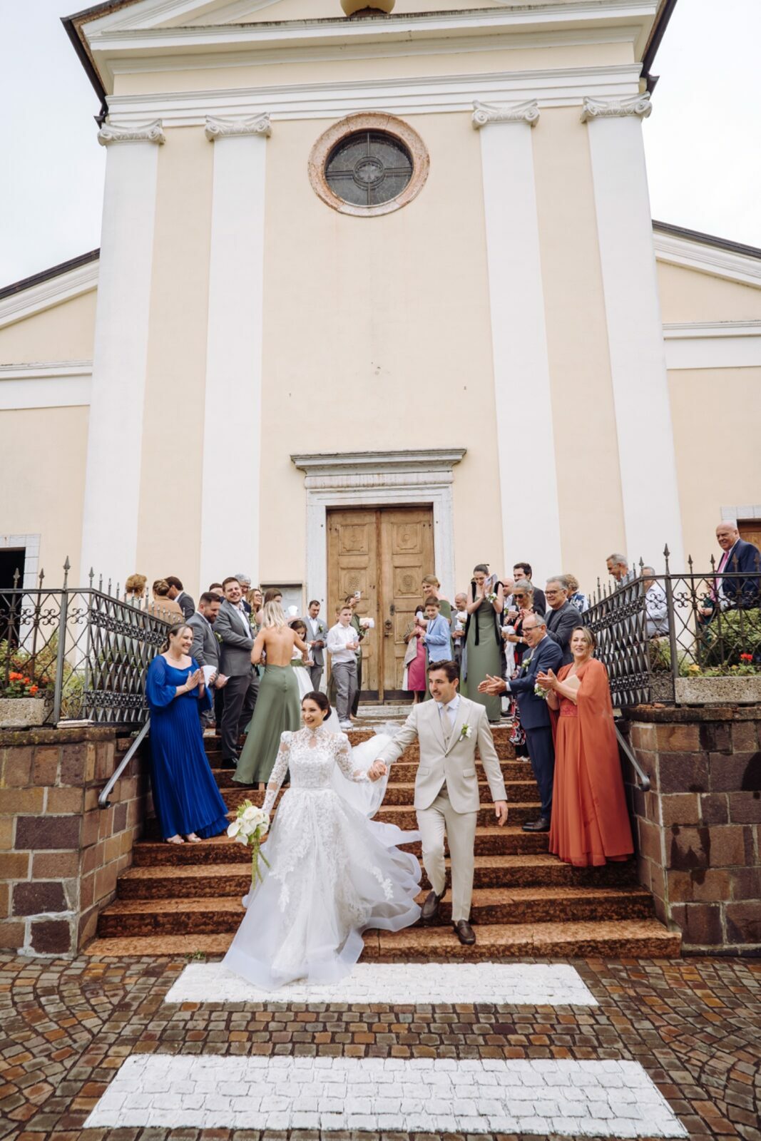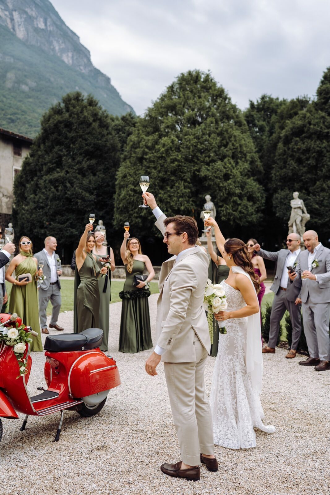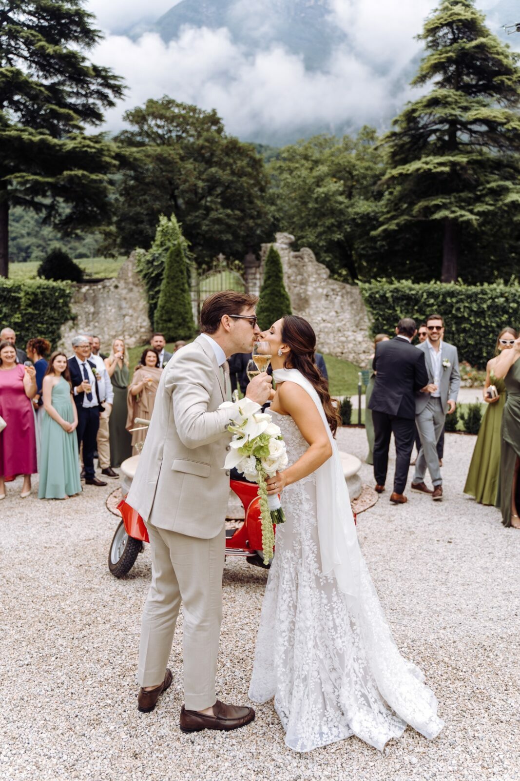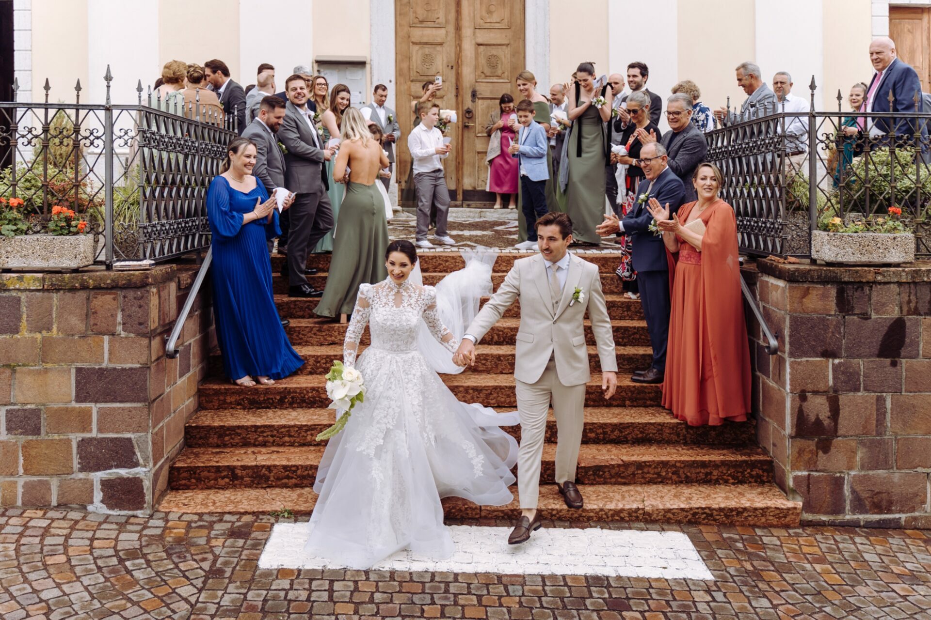 Casamento na terra dos antepassados do noivo, autêntico e emocionante. Cerimônia na igreja, na província de Trento, e recepção na Villa Bortolazzi, cercada por montanhas e parreirais. Destaque pro almoço em uma sala cheia de afrescos animado por um trio de músicas típicas italianas
