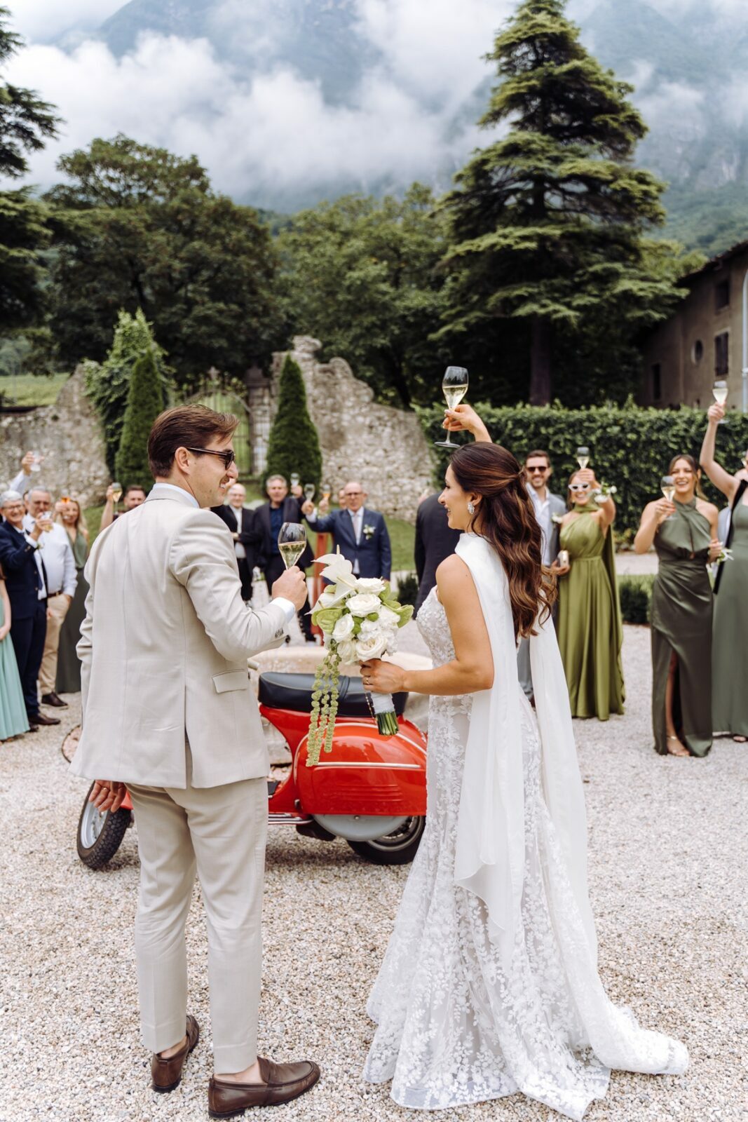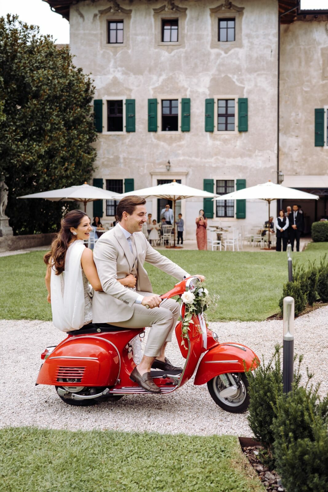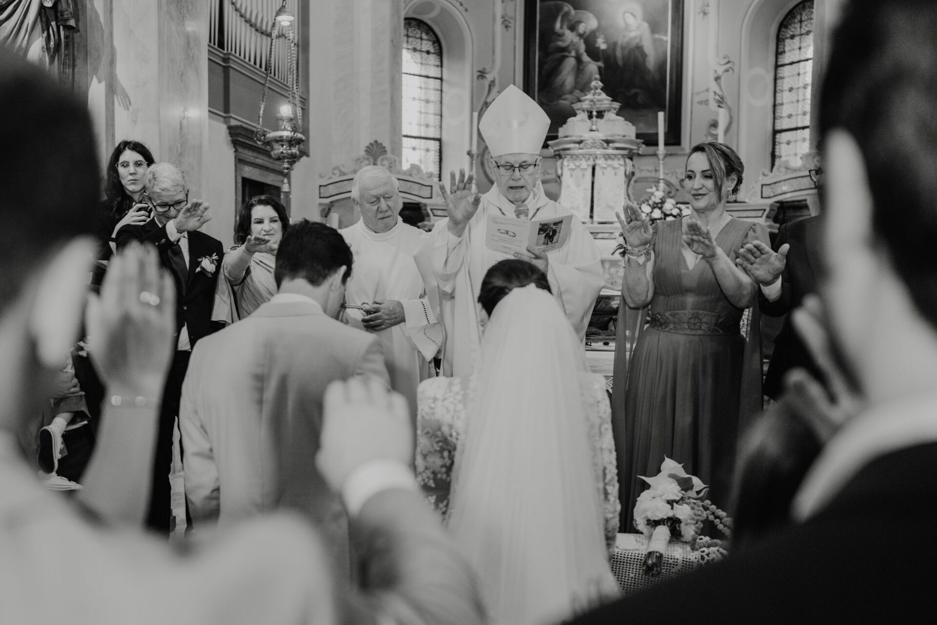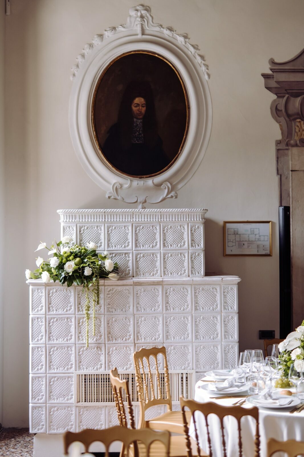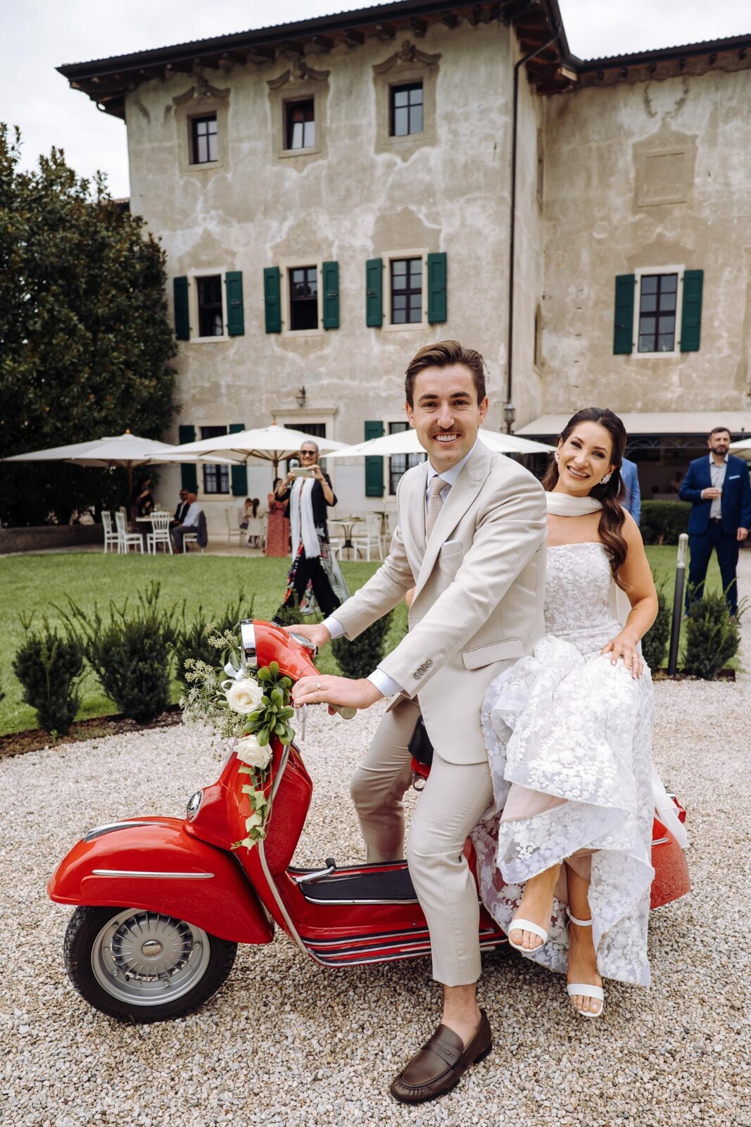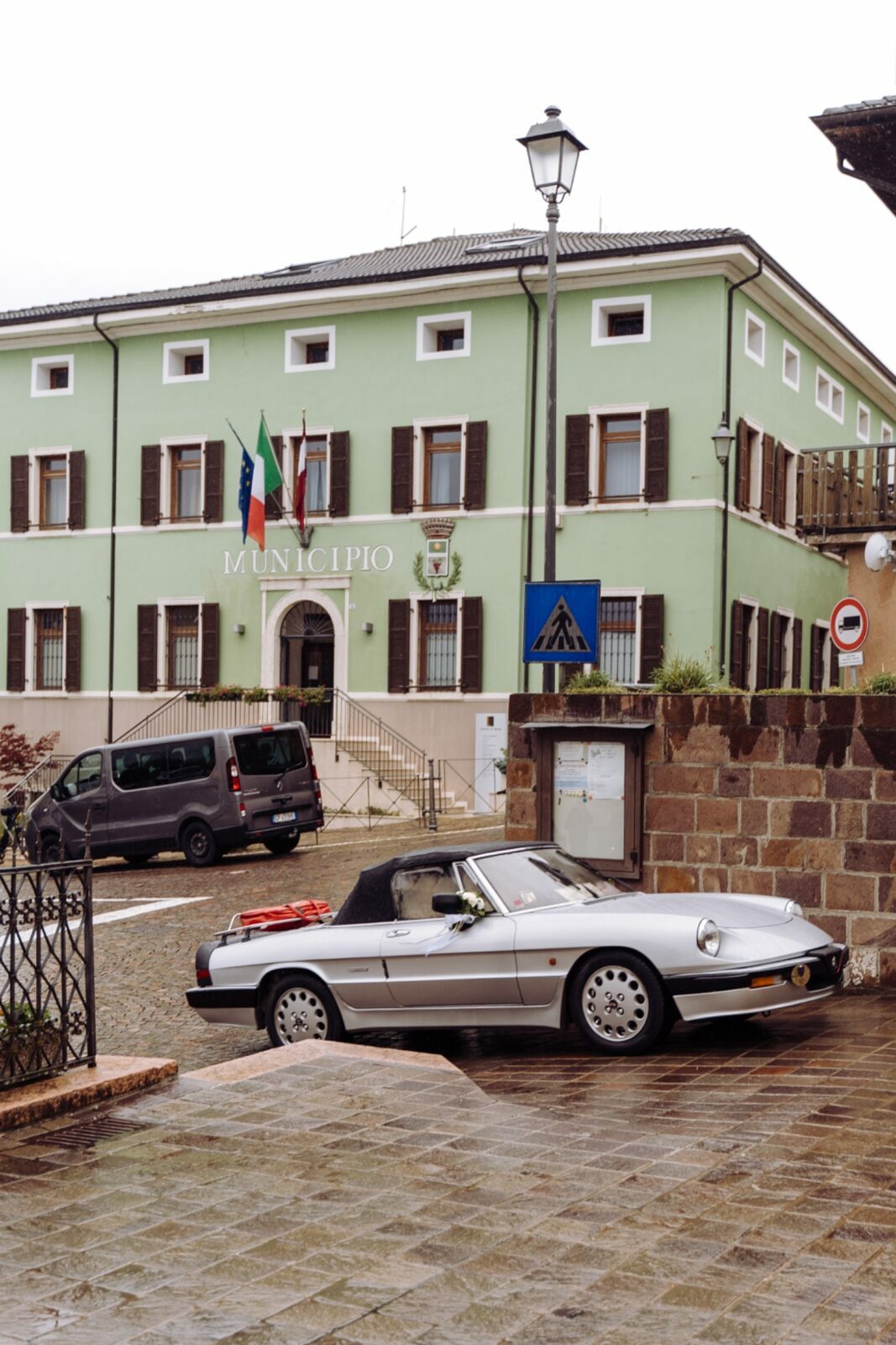 Casamento na terra dos antepassados do noivo, autêntico e emocionante. Cerimônia na igreja, na província de Trento, e recepção na Villa Bortolazzi, cercada por montanhas e parreirais. Destaque pro almoço em uma sala cheia de afrescos animado por um trio de músicas típicas italianas