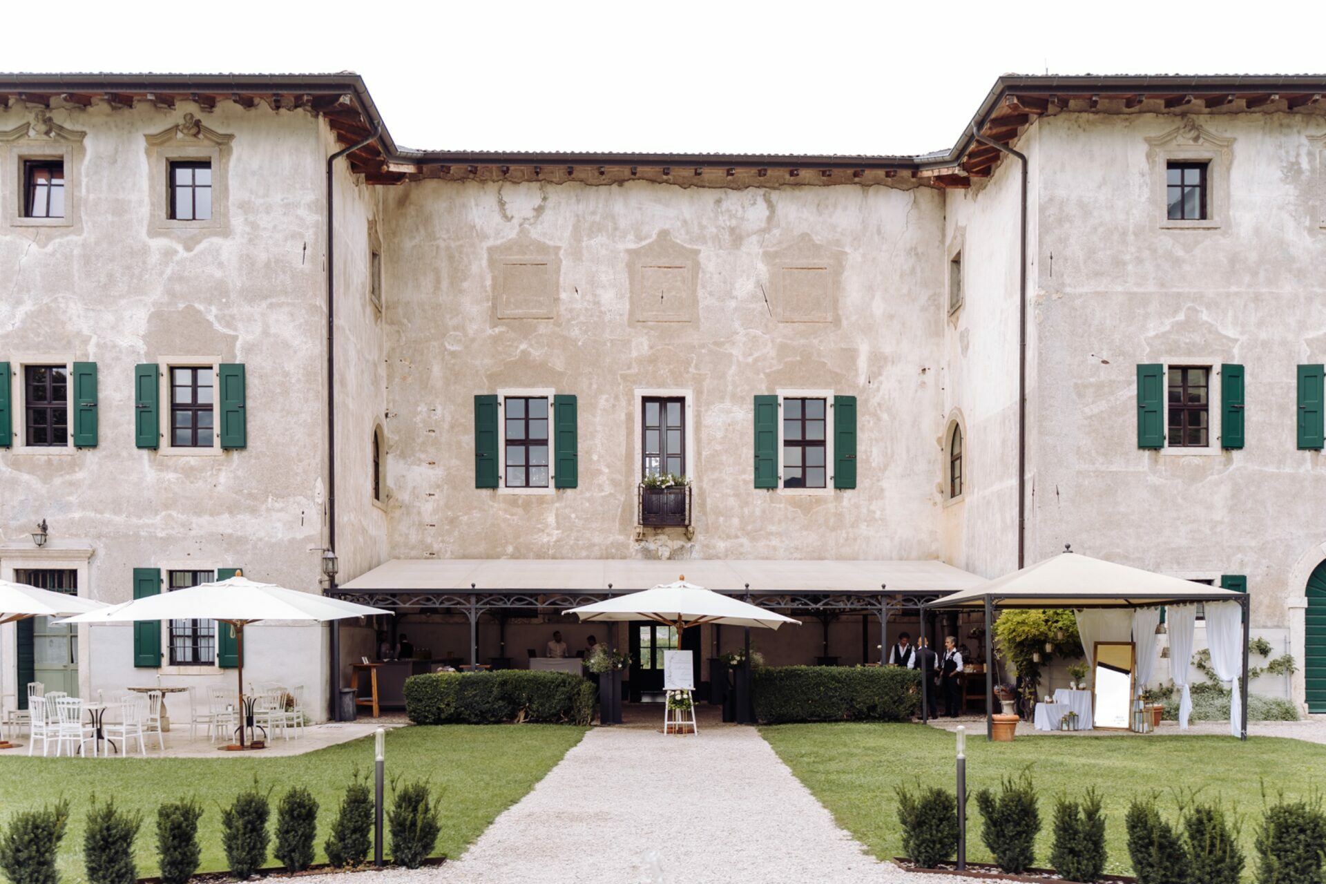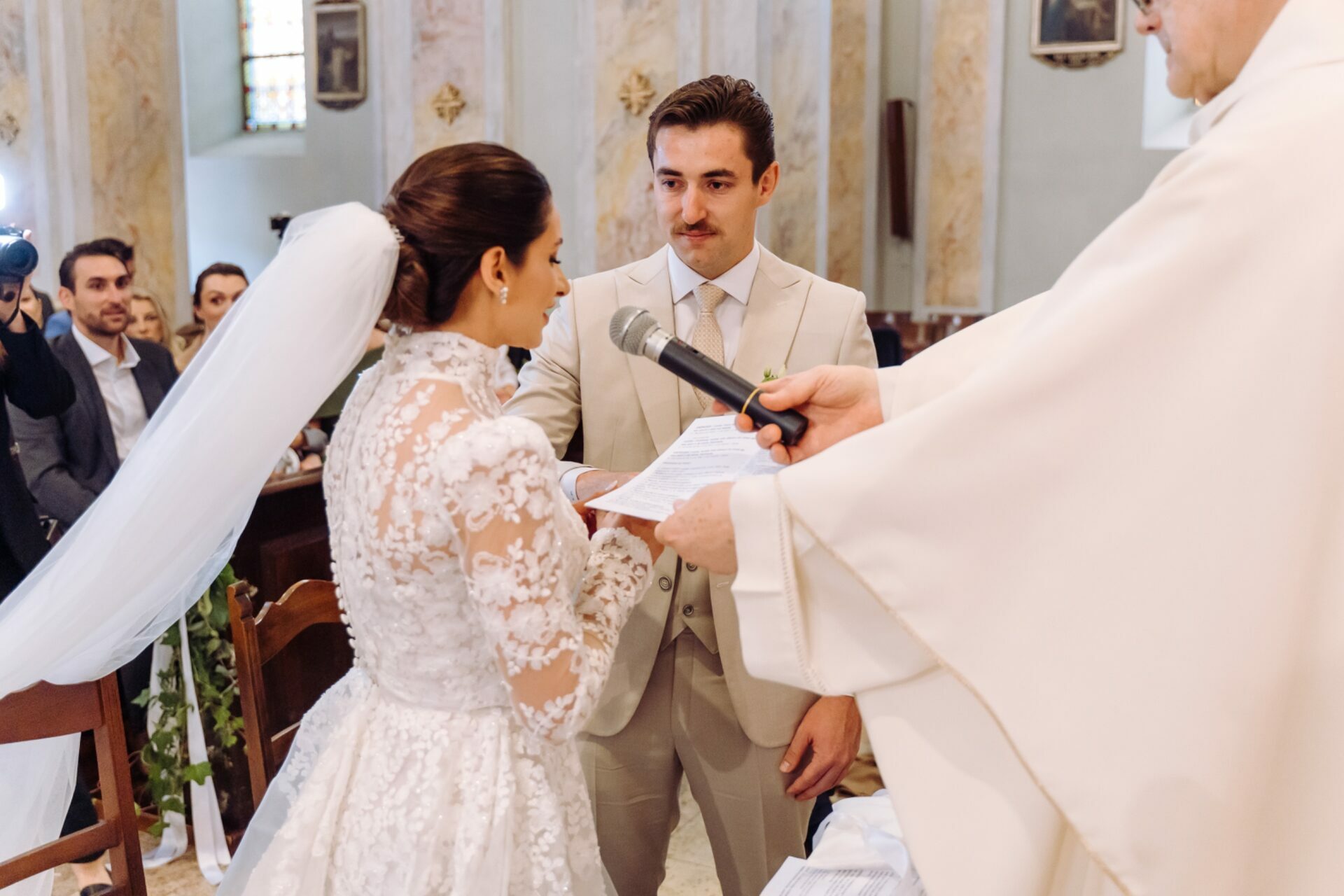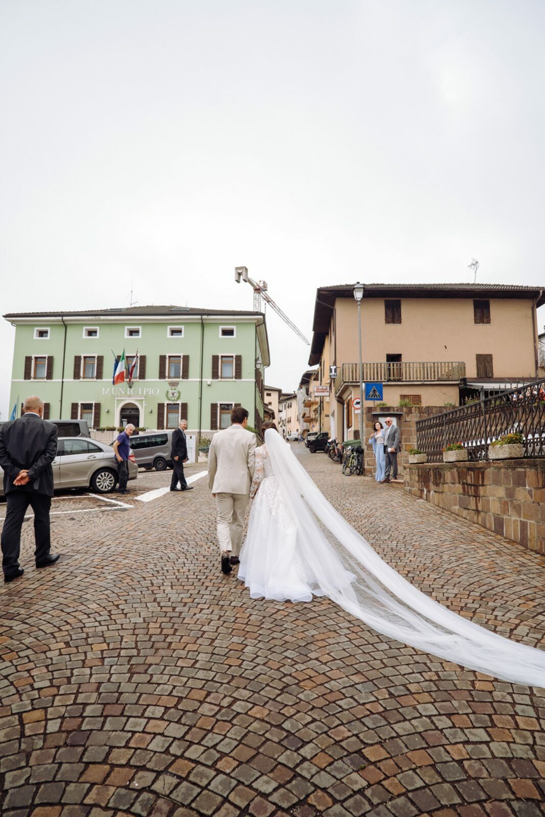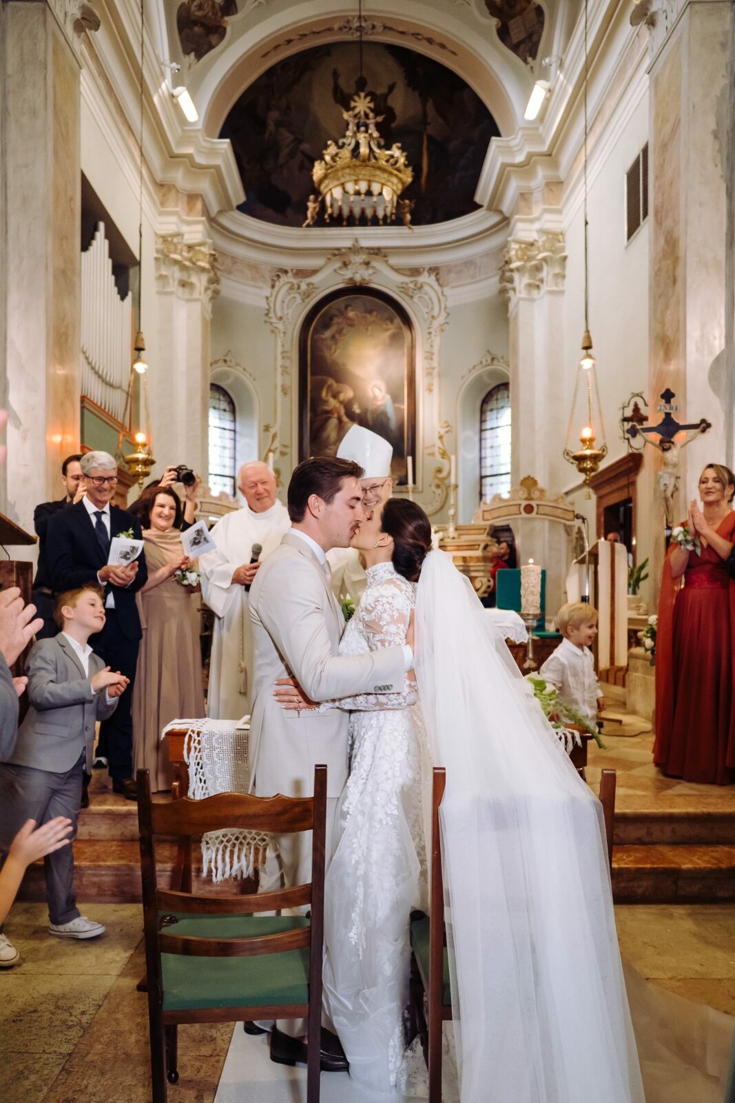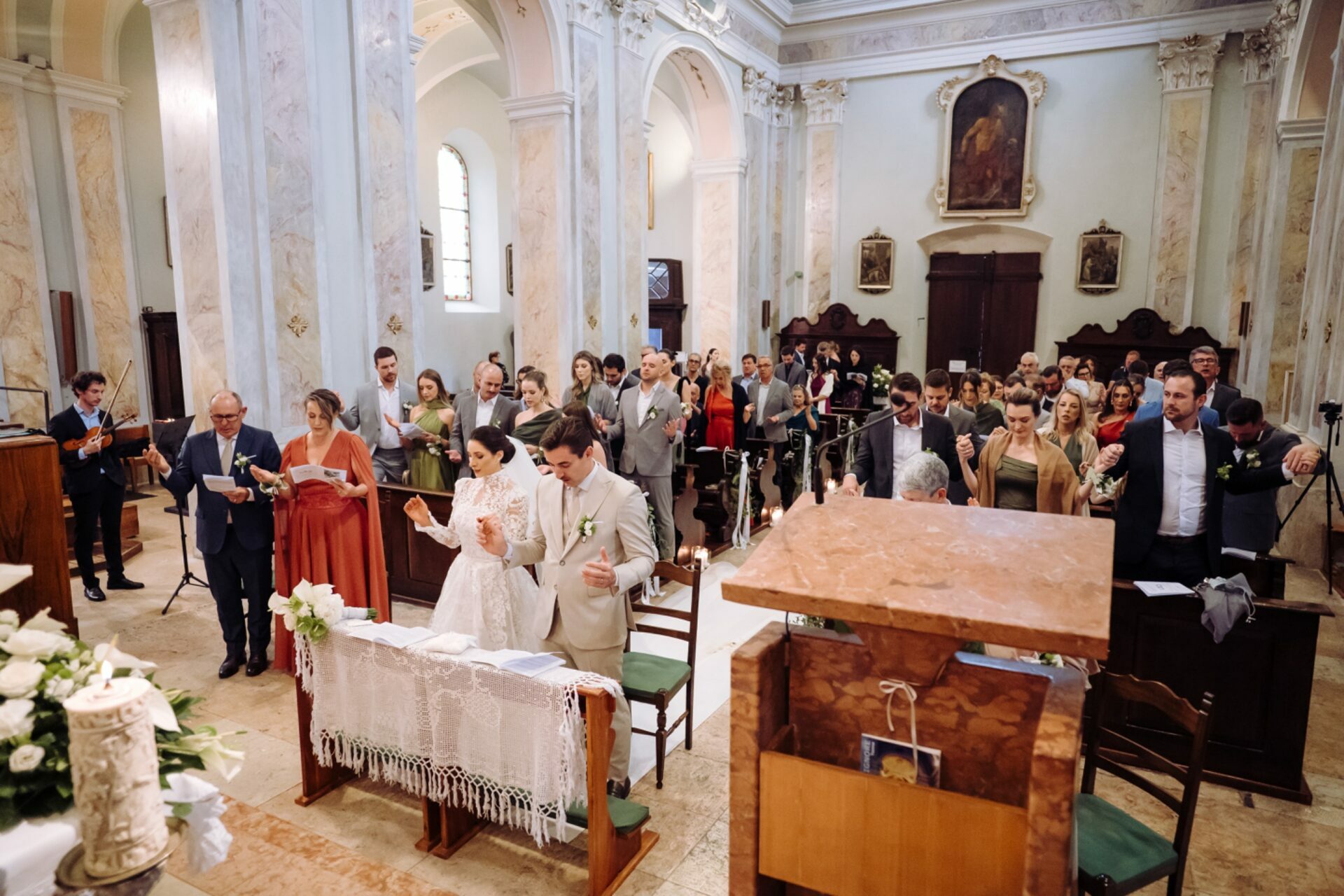 Casamento na terra dos antepassados do noivo, autêntico e emocionante. Cerimônia na igreja, na província de Trento, e recepção na Villa Bortolazzi, cercada por montanhas e parreirais. Destaque pro almoço em uma sala cheia de afrescos animado por um trio de músicas típicas italianas