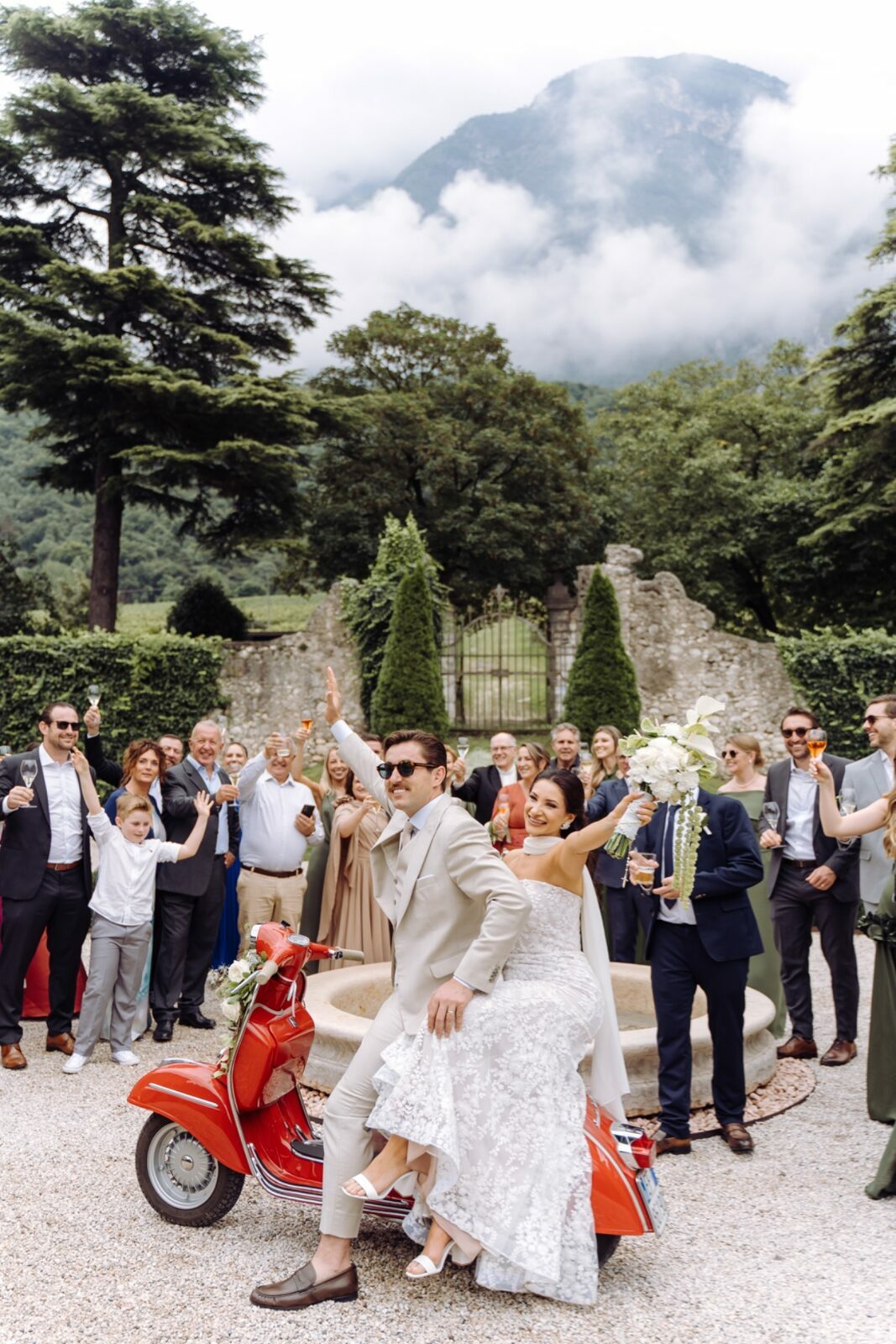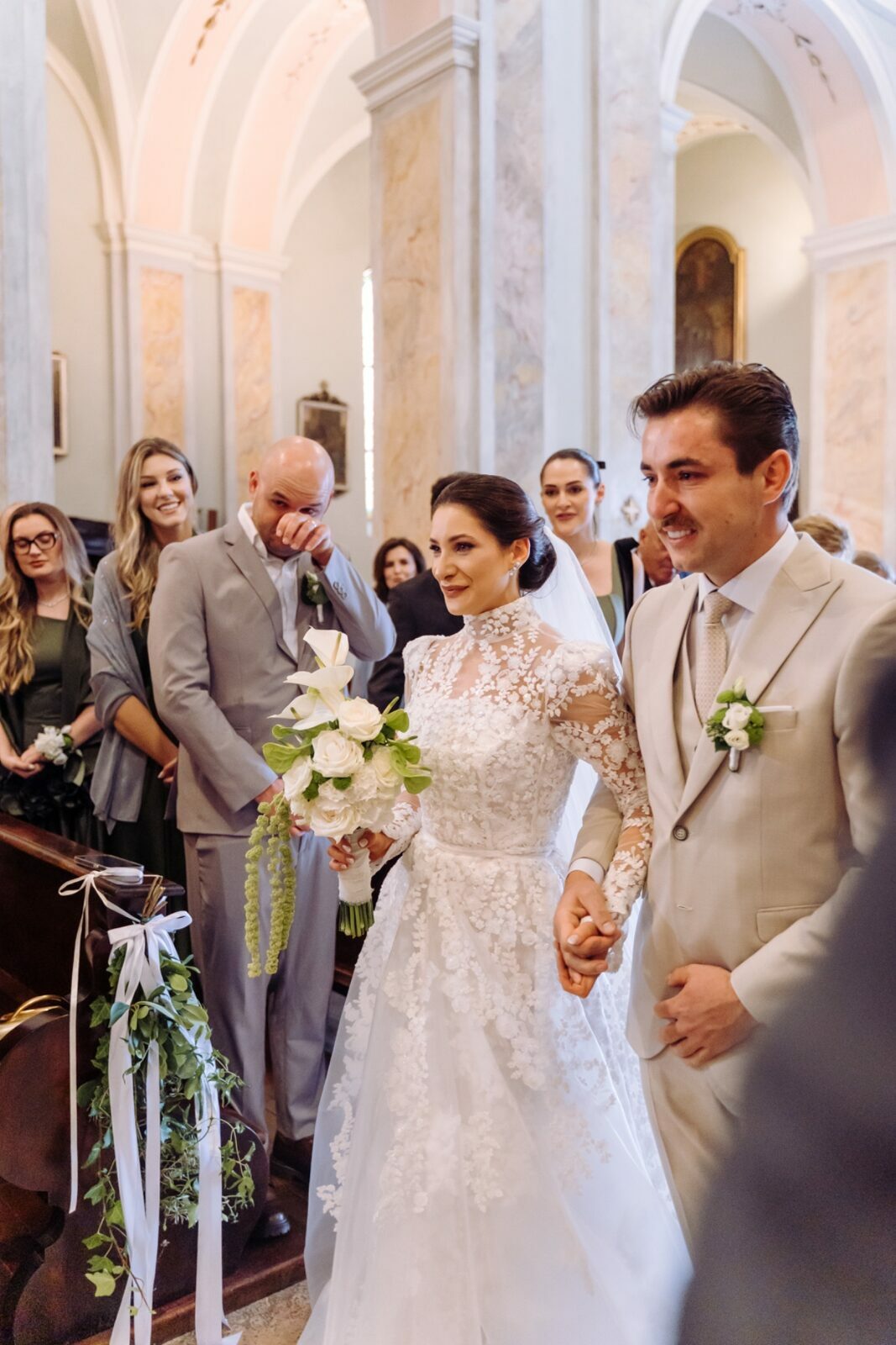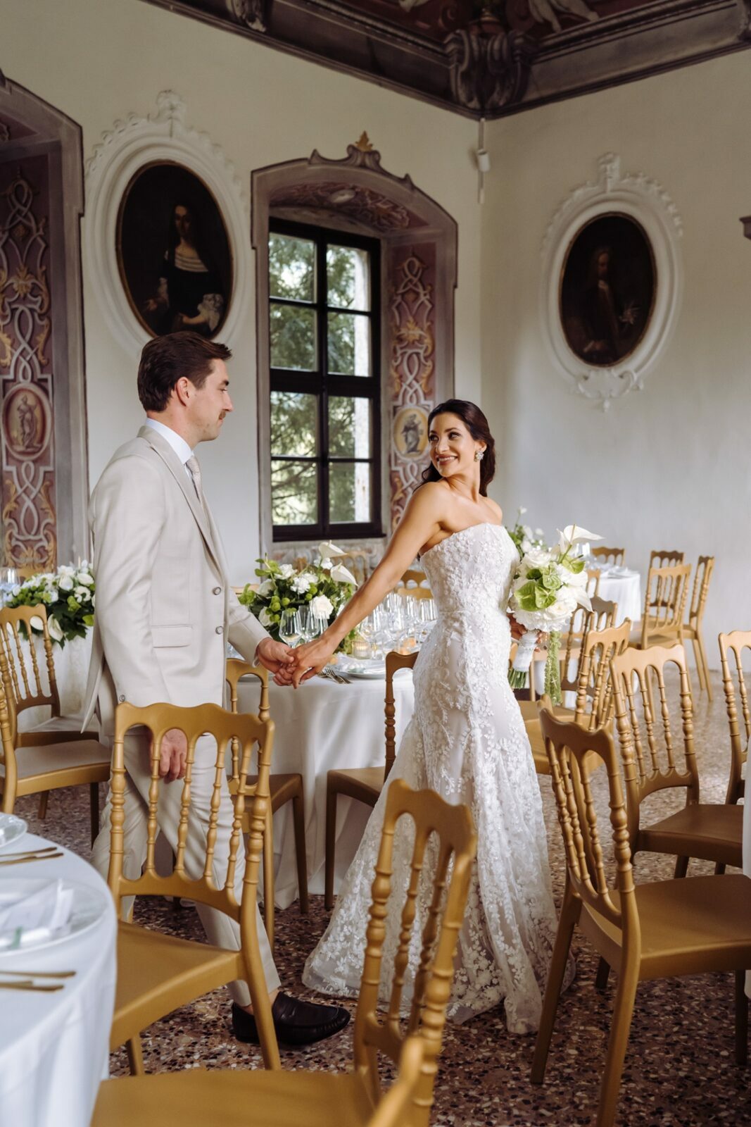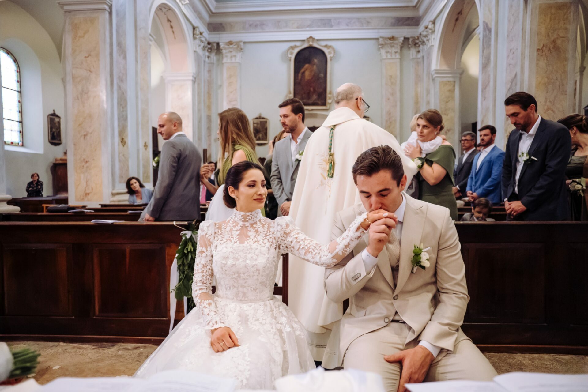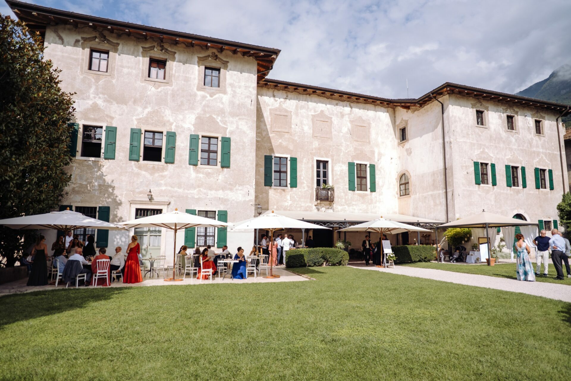 Casamento na terra dos antepassados do noivo, autêntico e emocionante. Cerimônia na igreja, na província de Trento, e recepção na Villa Bortolazzi, cercada por montanhas e parreirais. Destaque pro almoço em uma sala cheia de afrescos animado por um trio de músicas típicas italianas