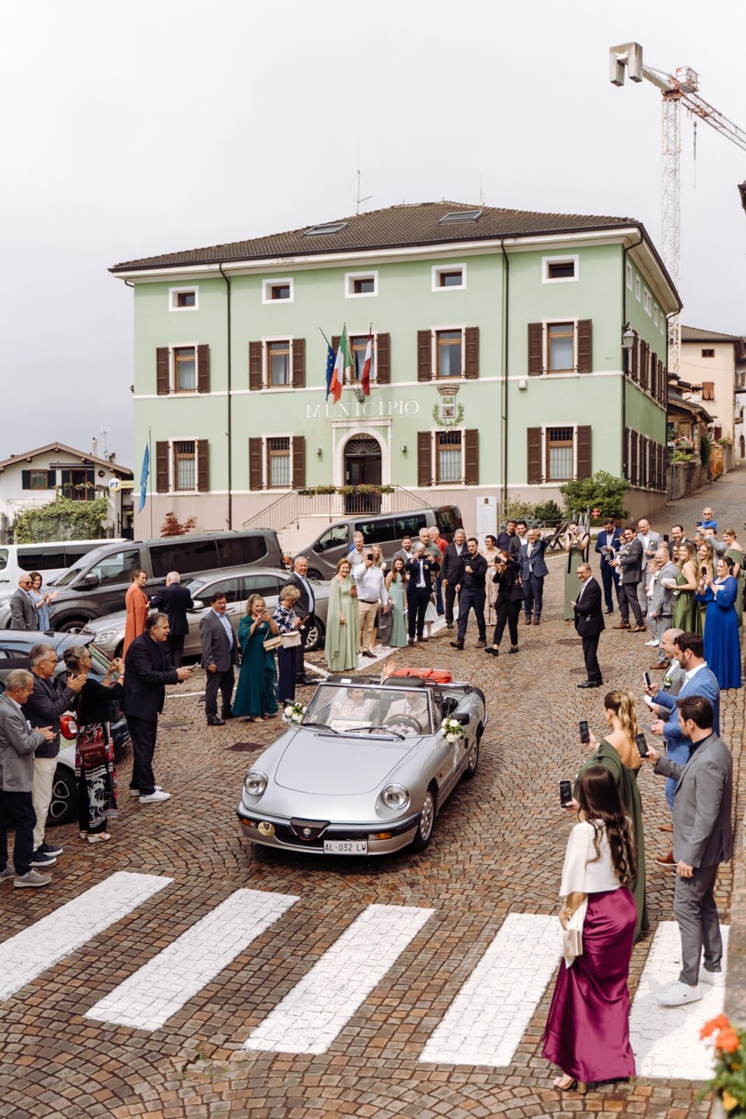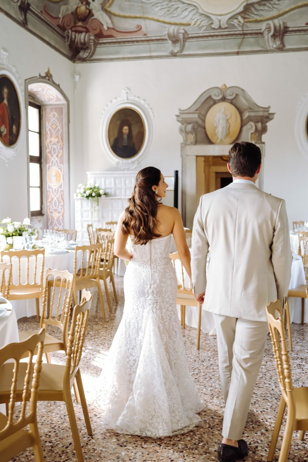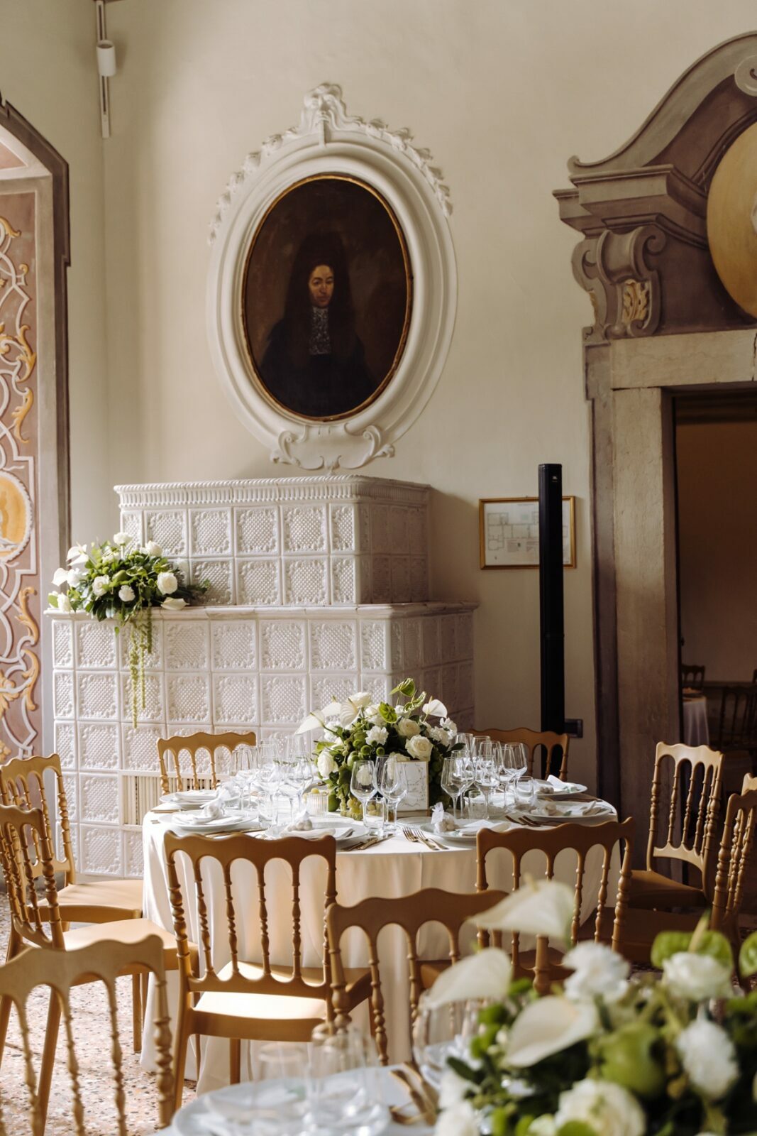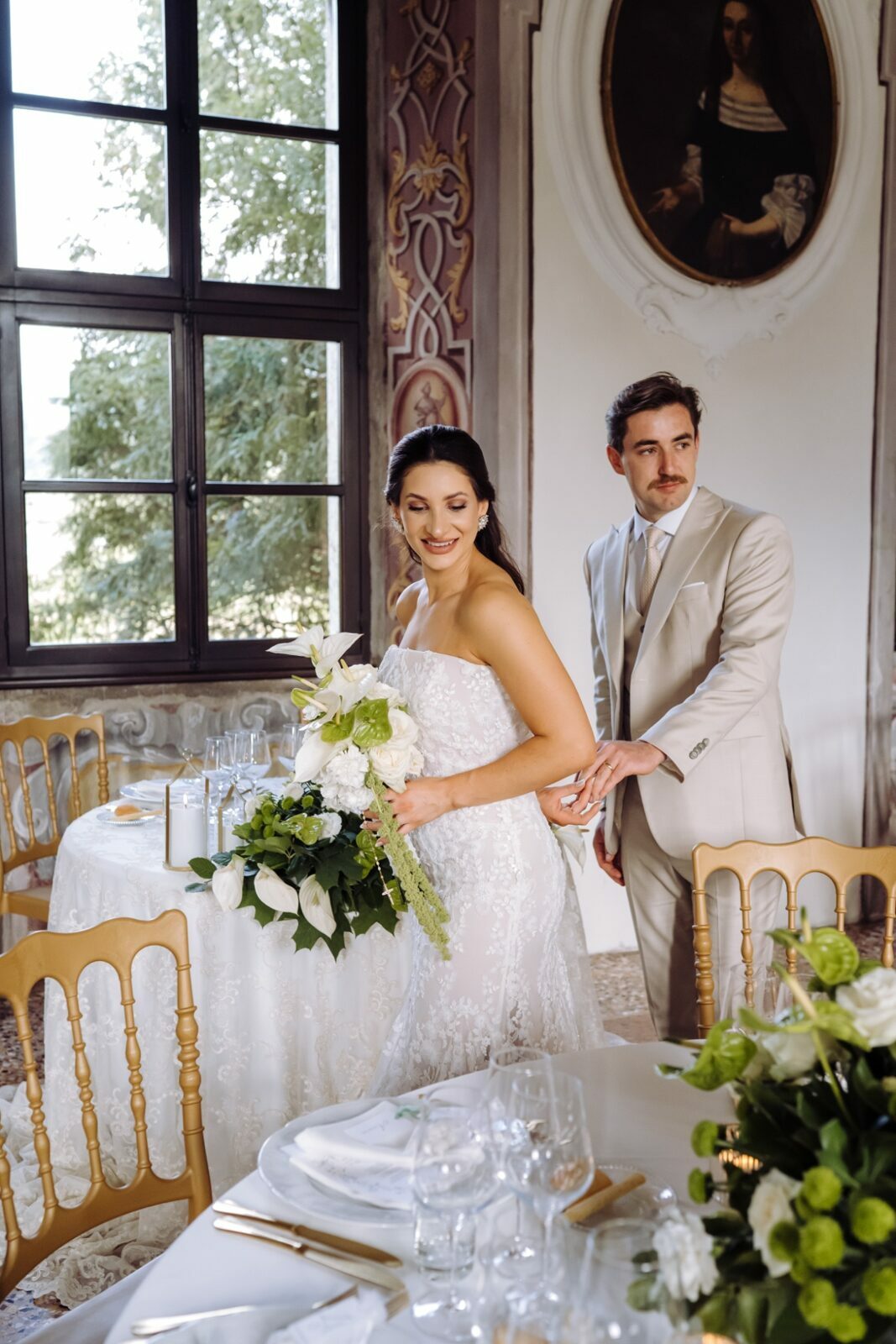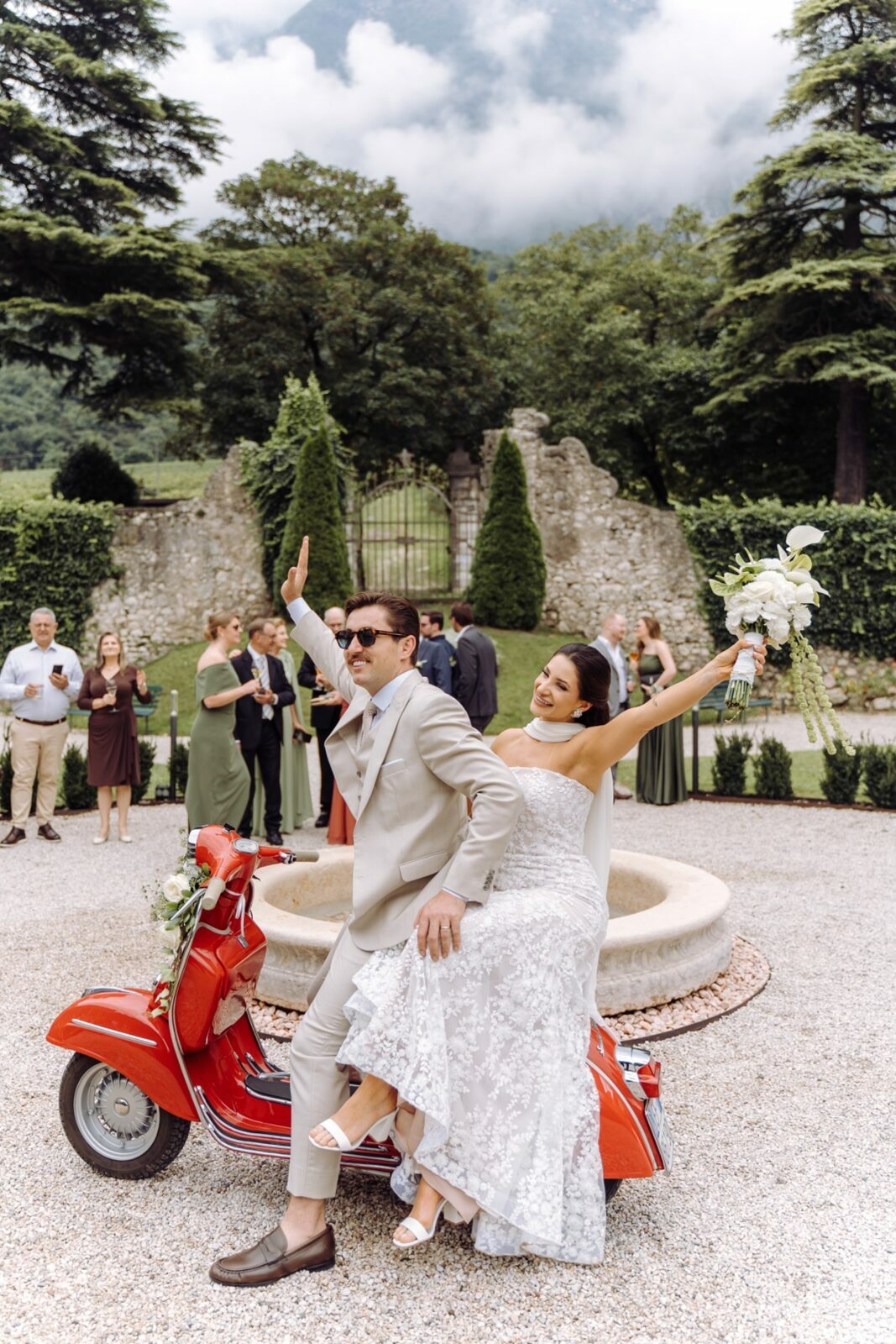 Casamento na terra dos antepassados do noivo, autêntico e emocionante. Cerimônia na igreja, na província de Trento, e recepção na Villa Bortolazzi, cercada por montanhas e parreirais. Destaque pro almoço em uma sala cheia de afrescos animado por um trio de músicas típicas italianas