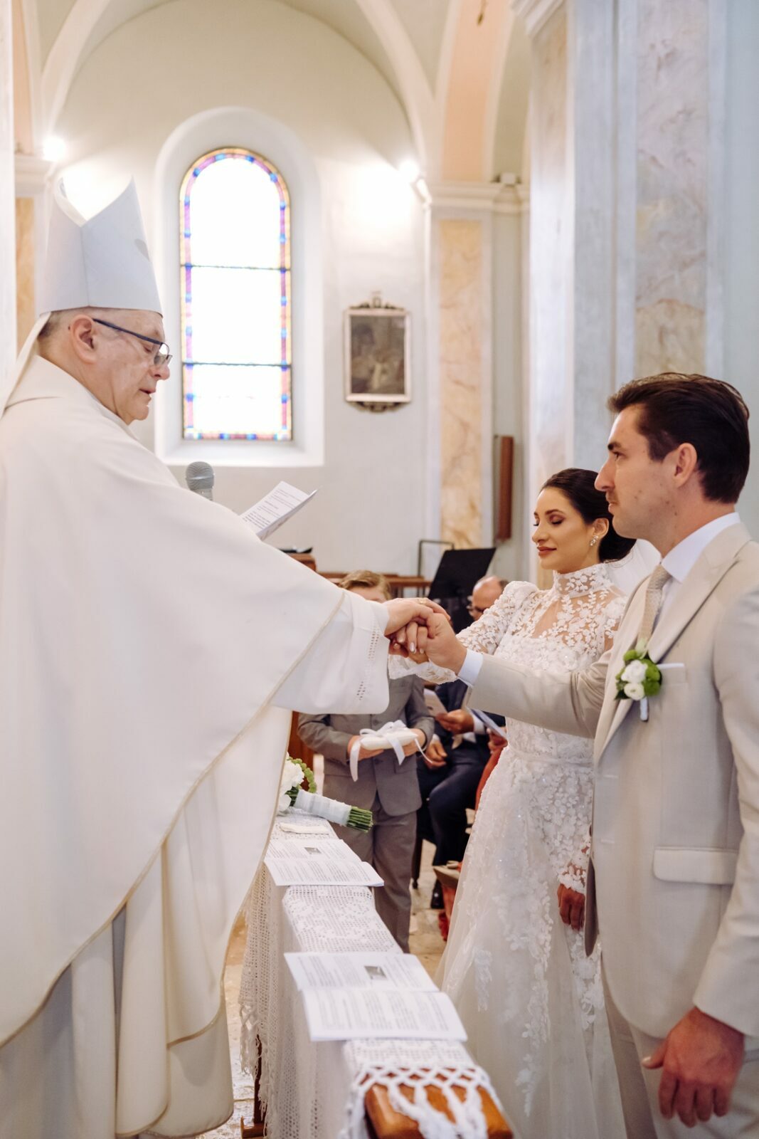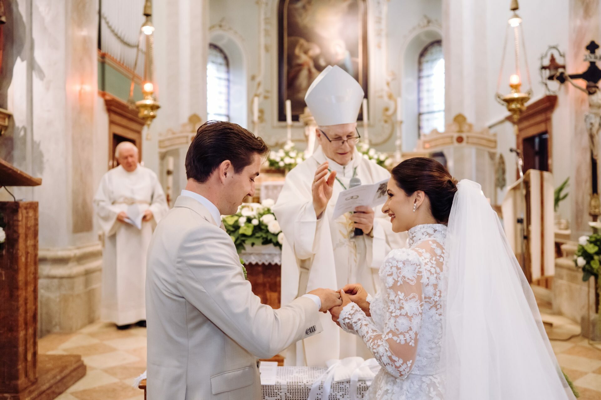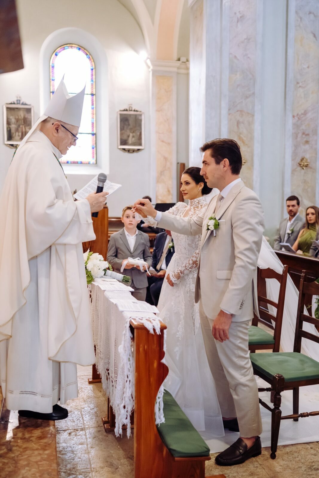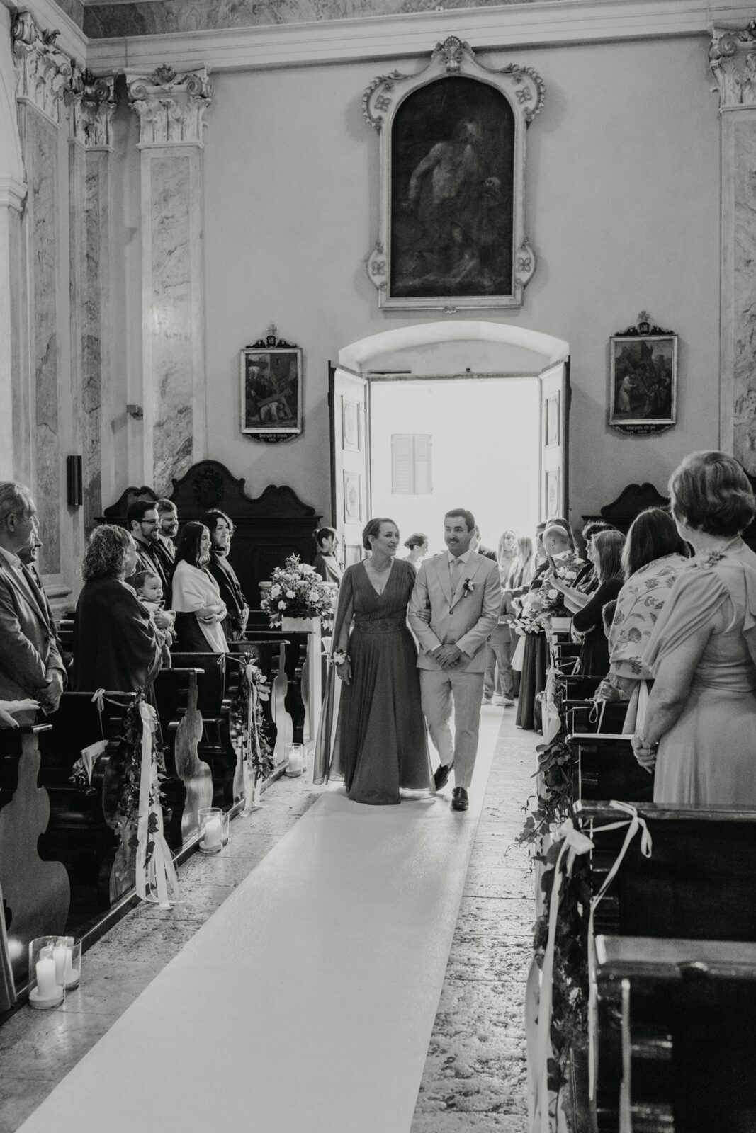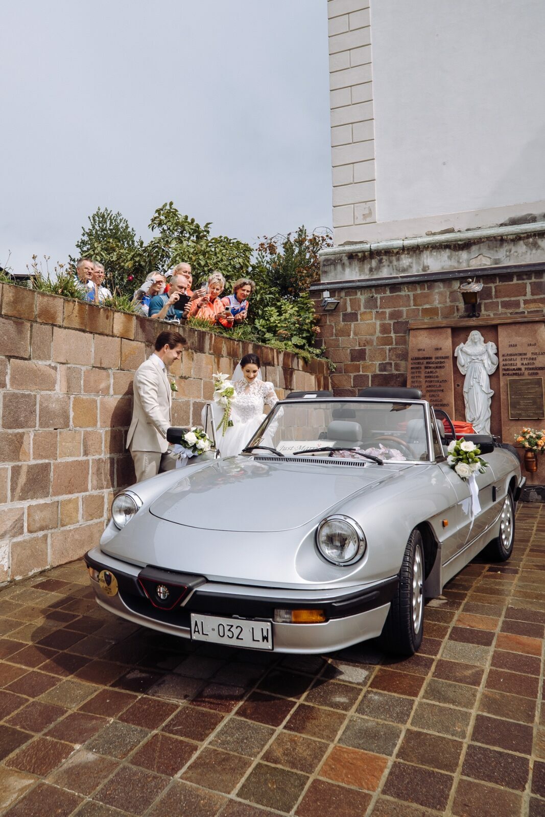 Casamento na terra dos antepassados do noivo, autêntico e emocionante. Cerimônia na igreja, na província de Trento, e recepção na Villa Bortolazzi, cercada por montanhas e parreirais. Destaque pro almoço em uma sala cheia de afrescos animado por um trio de músicas típicas italianas