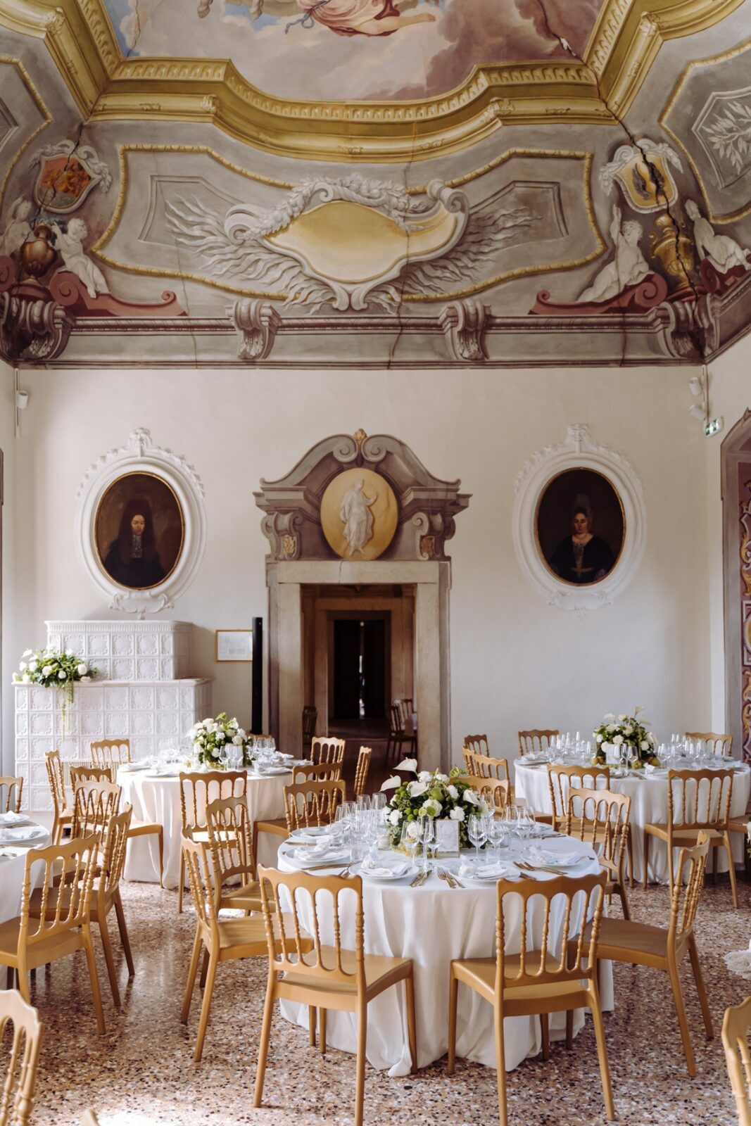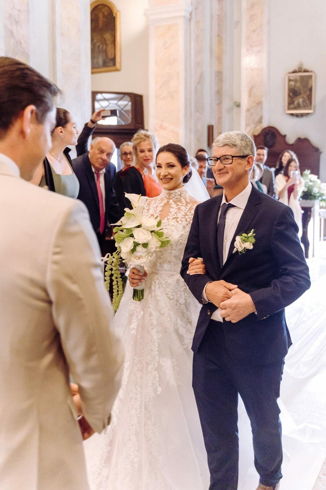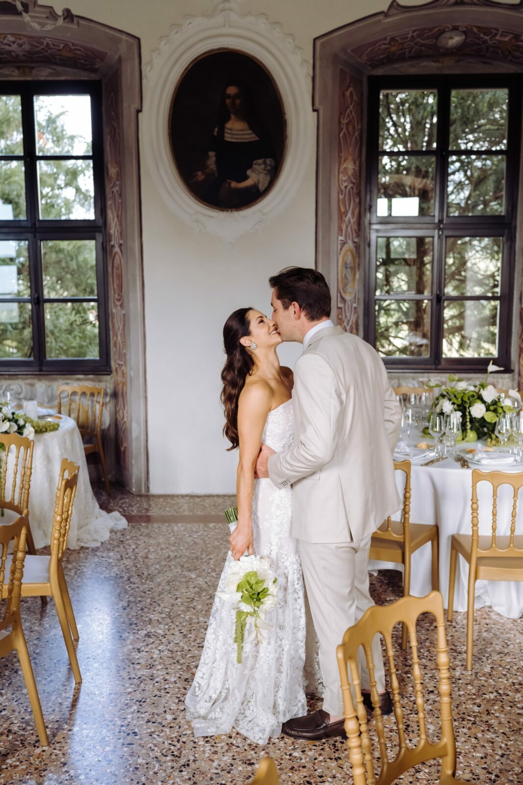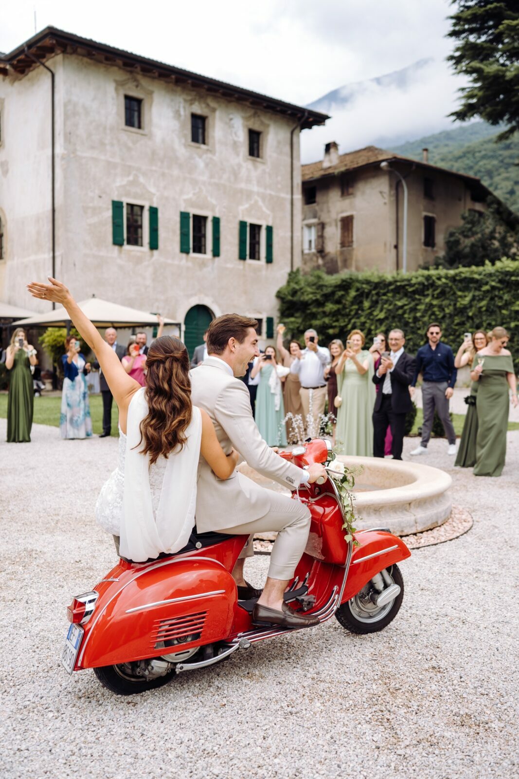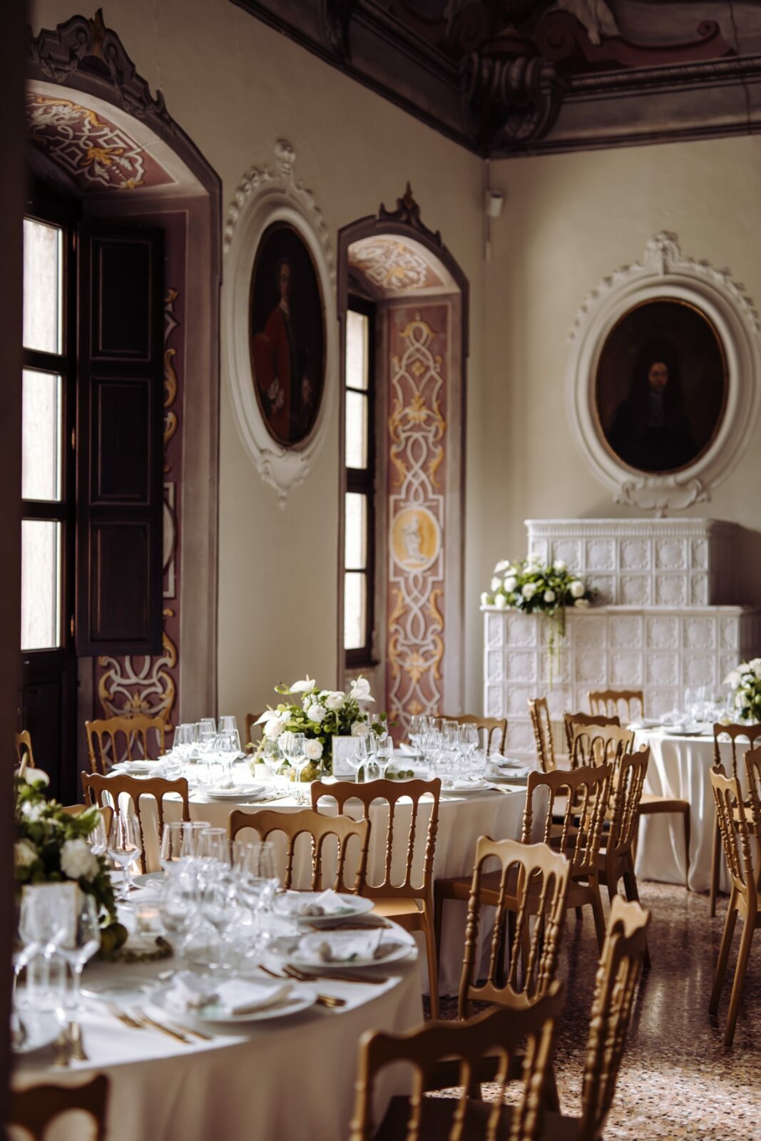 Casamento na terra dos antepassados do noivo, autêntico e emocionante. Cerimônia na igreja, na província de Trento, e recepção na Villa Bortolazzi, cercada por montanhas e parreirais. Destaque pro almoço em uma sala cheia de afrescos animado por um trio de músicas típicas italianas