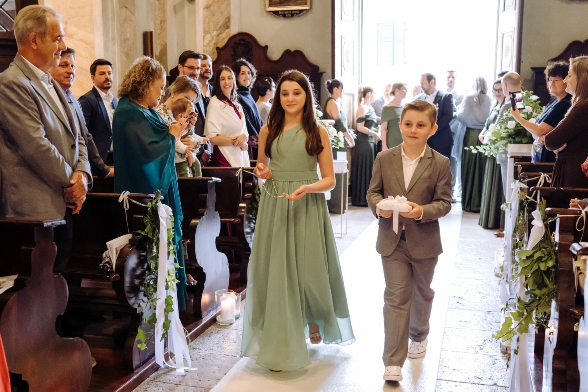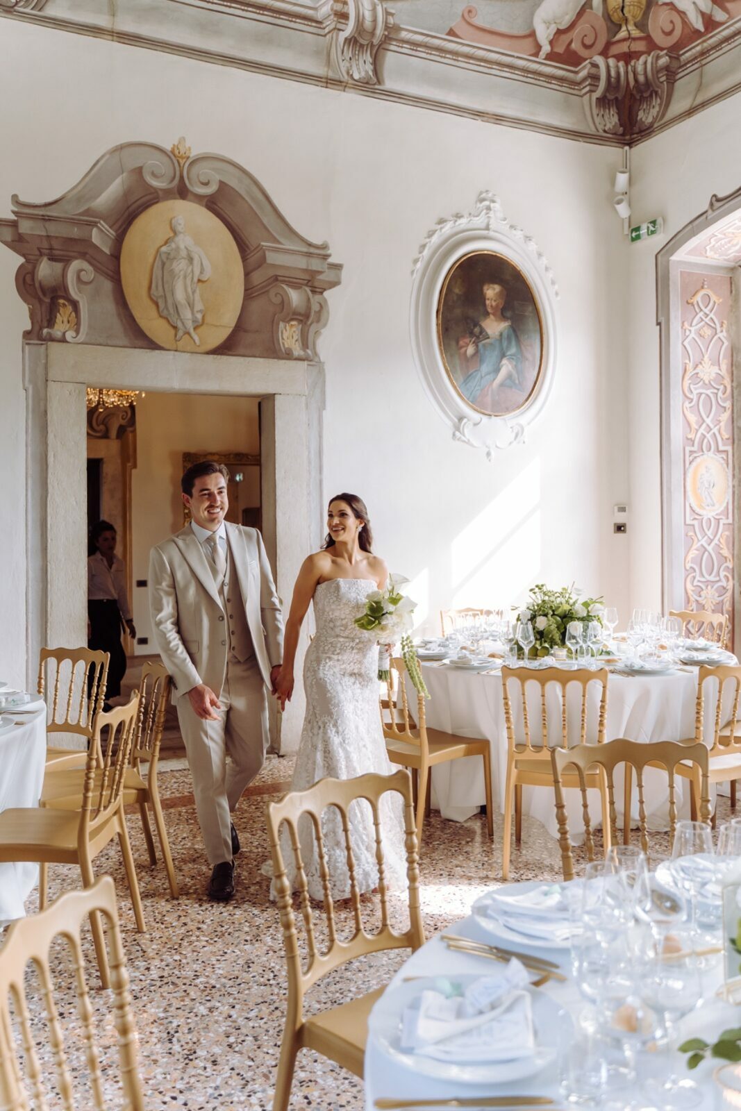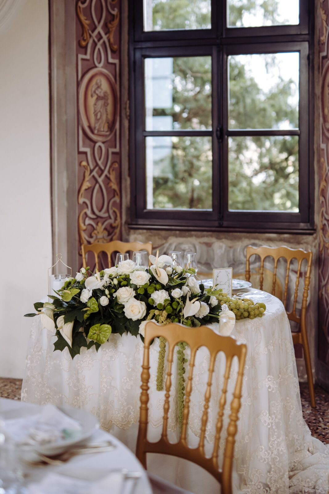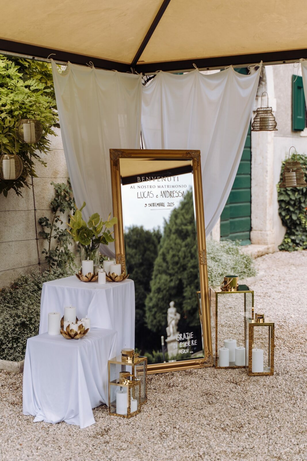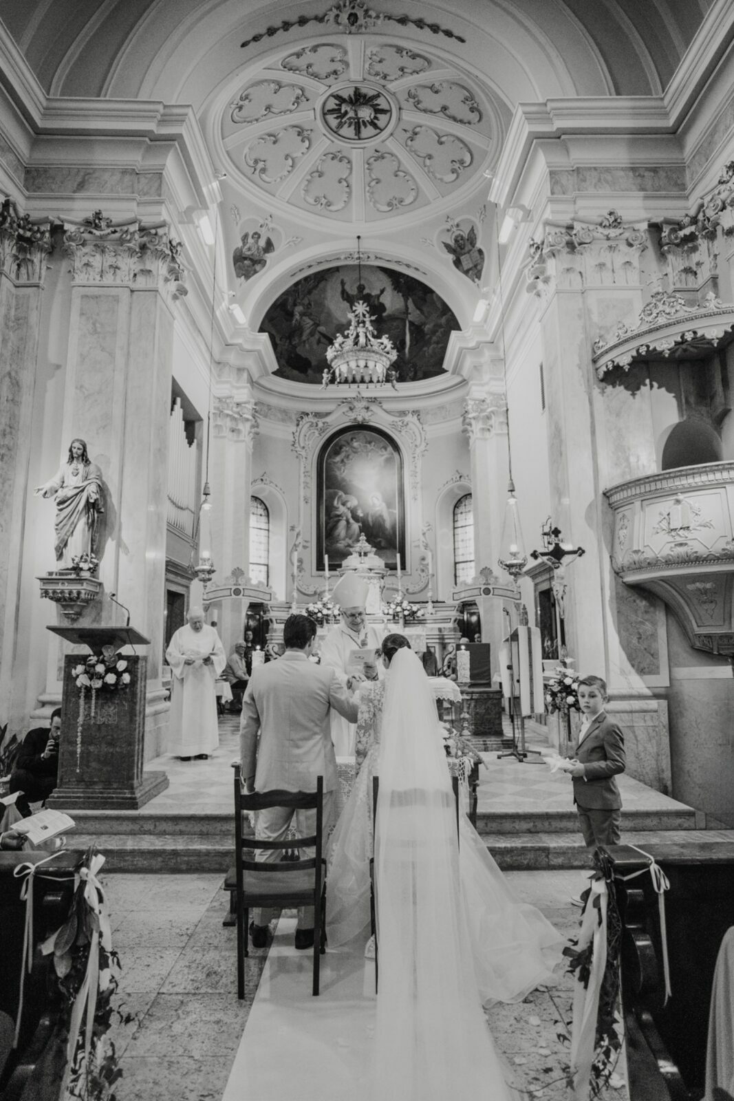 Casamento na terra dos antepassados do noivo, autêntico e emocionante. Cerimônia na igreja, na província de Trento, e recepção na Villa Bortolazzi, cercada por montanhas e parreirais. Destaque pro almoço em uma sala cheia de afrescos animado por um trio de músicas típicas italianas